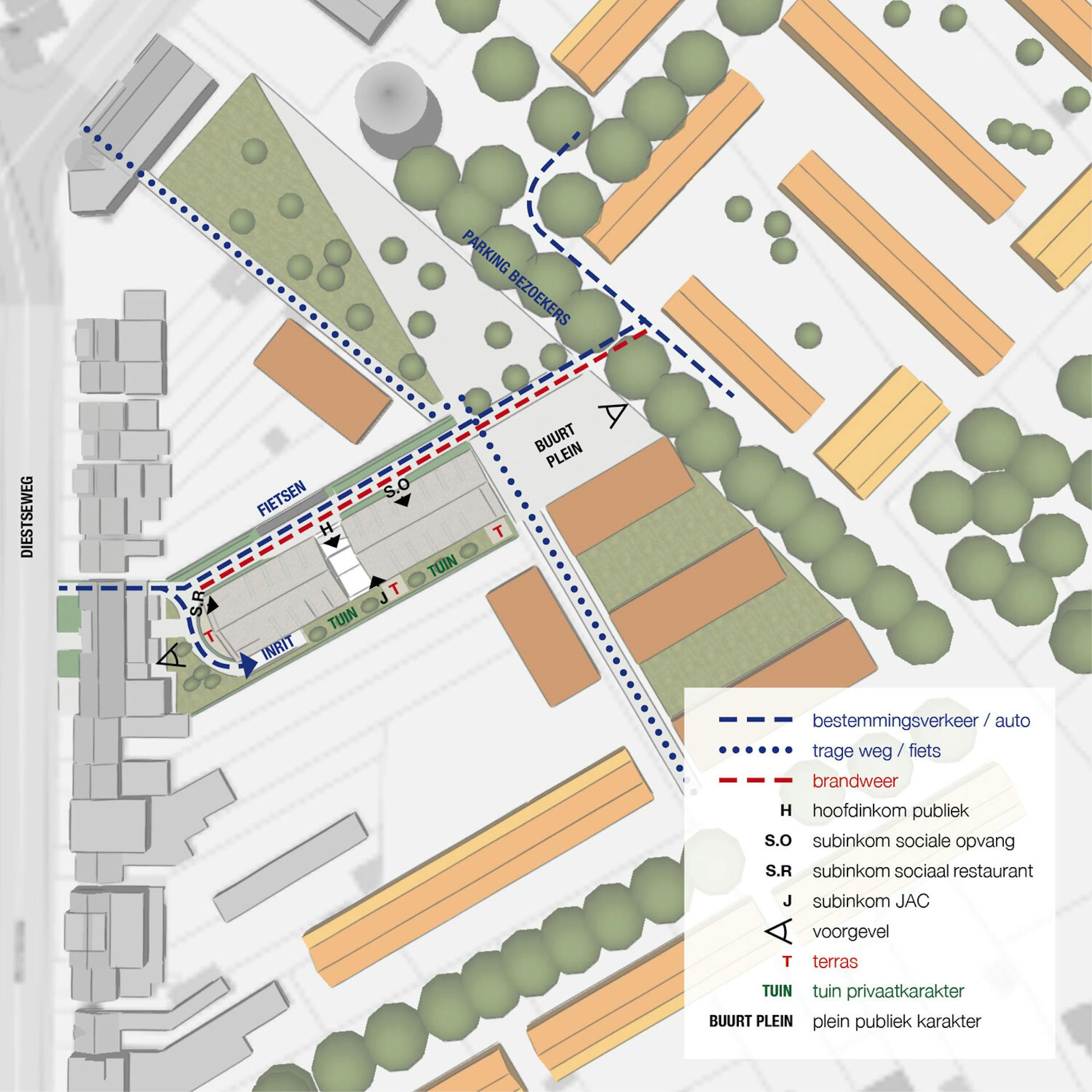 Het ontwerp houdt rekening met de toekomstige ontwikkeling en doorwaadbaarheid van het nog niet ontsloten achtergelegen binnengebied langs de Diestseweg. Dit gebied zal in de toekomst worden ontwikkeld door ‘de Kleine Landeigendom’ overeenkomstig het masterplan Wijdbosch waarin ruimte is voorzien voor binnenstedelijk wonen, autoluwe buurtpleinen en groen.