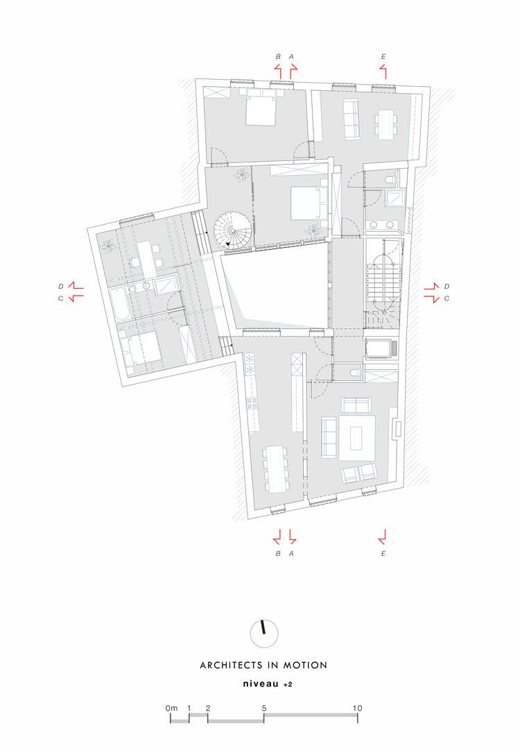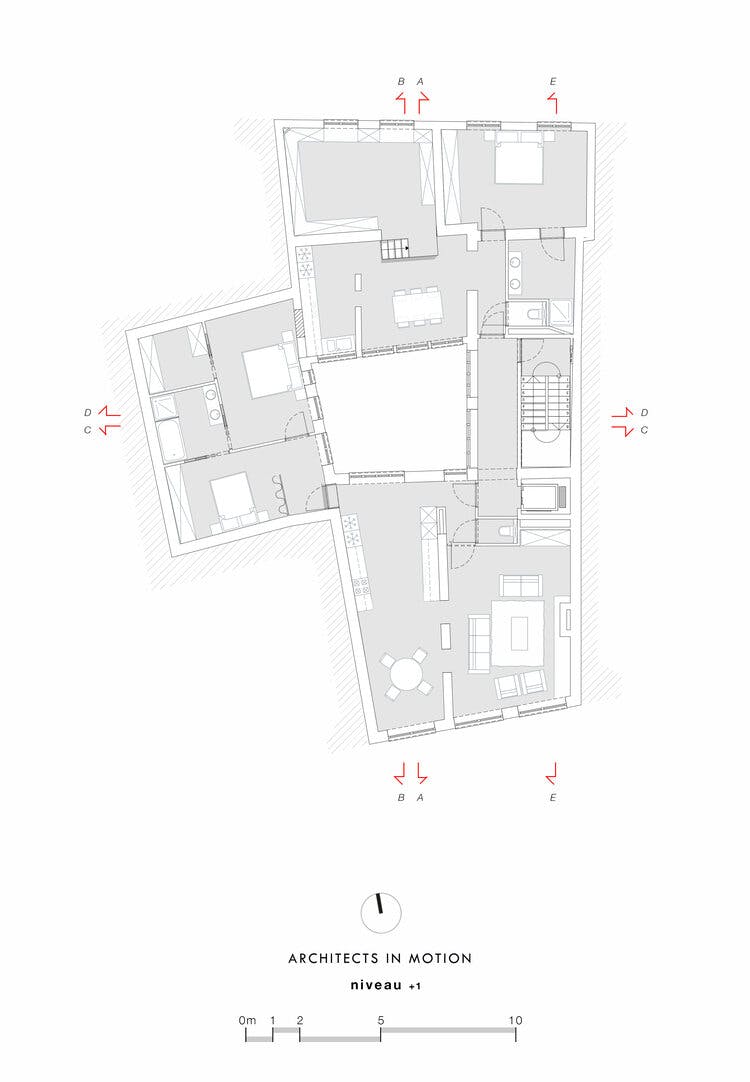 Het was de uitdrukkelijke wens van de huidige bouwheer om terug te keren naar het aantal woongelegenheden van de laatst vergunde toestand, namelijk een plan uit 1988 van architect Hugo Kinnaer. Daarom koos AIM er samen met de bouwheer voor om de eerste verdieping terug op te splitsen in twee woongelegenheden wat mits enkele kleinere ingrepen perfect mogelijk bleek.