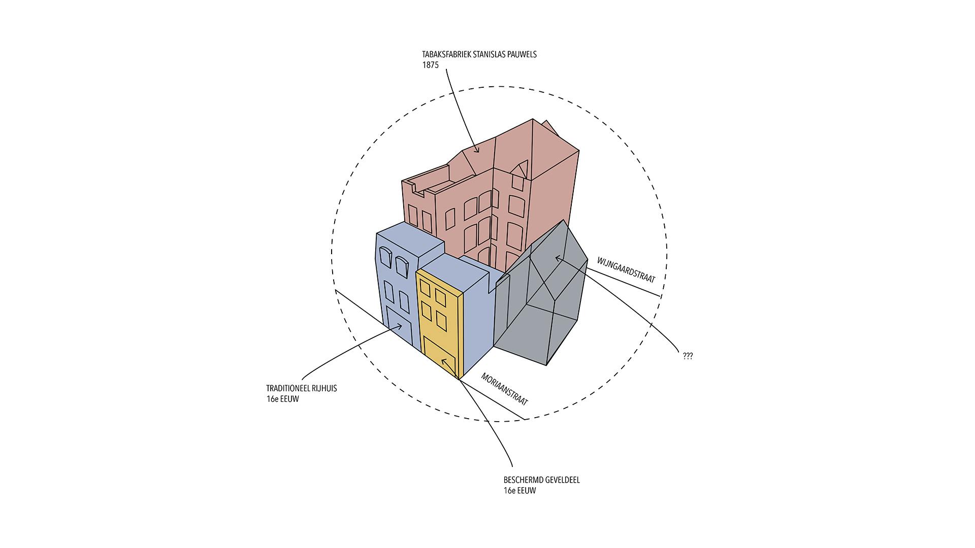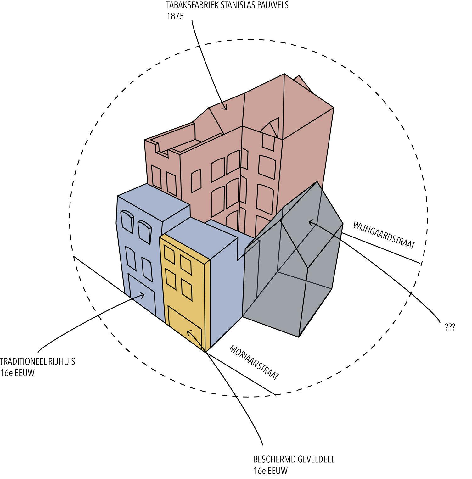 Het project, gesitueerd tussen de Moriaanstraat en de Wijngaardstraat in het historische hart van Antwerpen, bestond oorspronkelijk uit drie woningen die ondertussen in elkaar doorlopen en verschillende keren al of niet met succes verbouwd en/of gerenoveerd werden. Een bijzonderheid aan het project is dat zich op de derde en vierde verdieping een duplexappartement van een andere eigenaar bevindt. Het gebouw was vergund als meergezinswoning met 5 wooneenheden. In de praktijk was de situatie echter anders: de vorige eigenaars hadden er 3 wooneenheden in gemaakt, inclusief enkele bouwovertredingen. De huidige eigenaar wil terug naar het oorspronkelijke aantal, namelijk 5 en wil de totaliteit regulariseren tot een eigentijds en kwalitatief geheel.