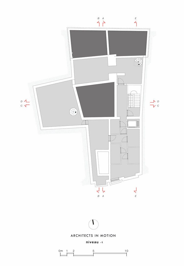 Het volledige bouwblok is onderkelderd met uitzondering van de twee ruimtes gelegen aan de Moriaanstraat en de binnenplaats. In het nieuwe ontwerp van AIM wordt de kelder opgesplitst in 3 units. Via de nieuwe trap is de gemeenschappelijke kelder met per appartement een berging bereikbaar. De linkerzijde van de kelder in de Wijngaardstraat vormt samen met deze onder het derde gebouw in het blok een kelder voor de handelsruimte. Deze is bereikbaar via een aparte spiltrap. Een derde kelder situeert zich onder het pand in de Moriaanstraat en is eveneens via een aparte spiltrap bereikbaar.