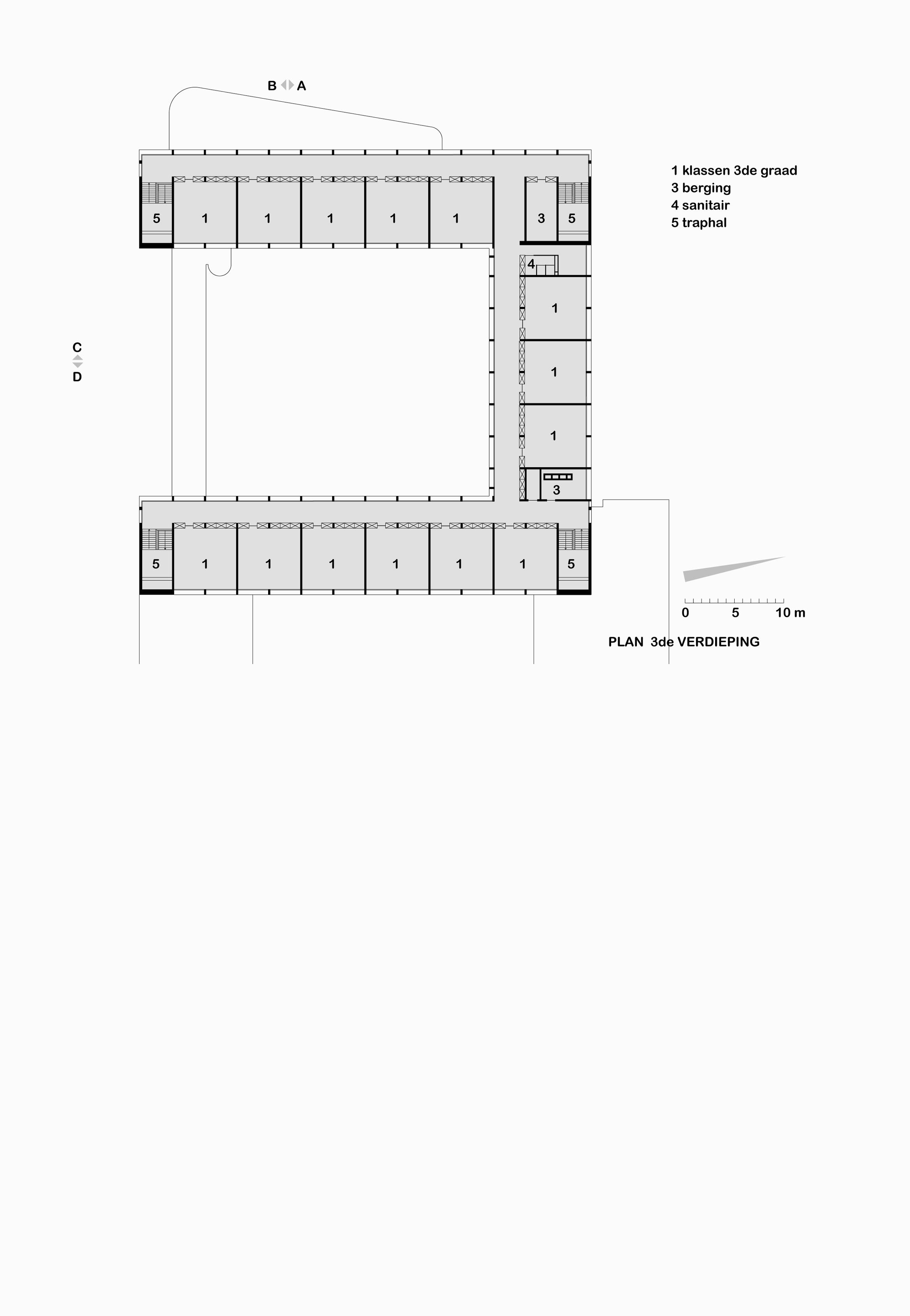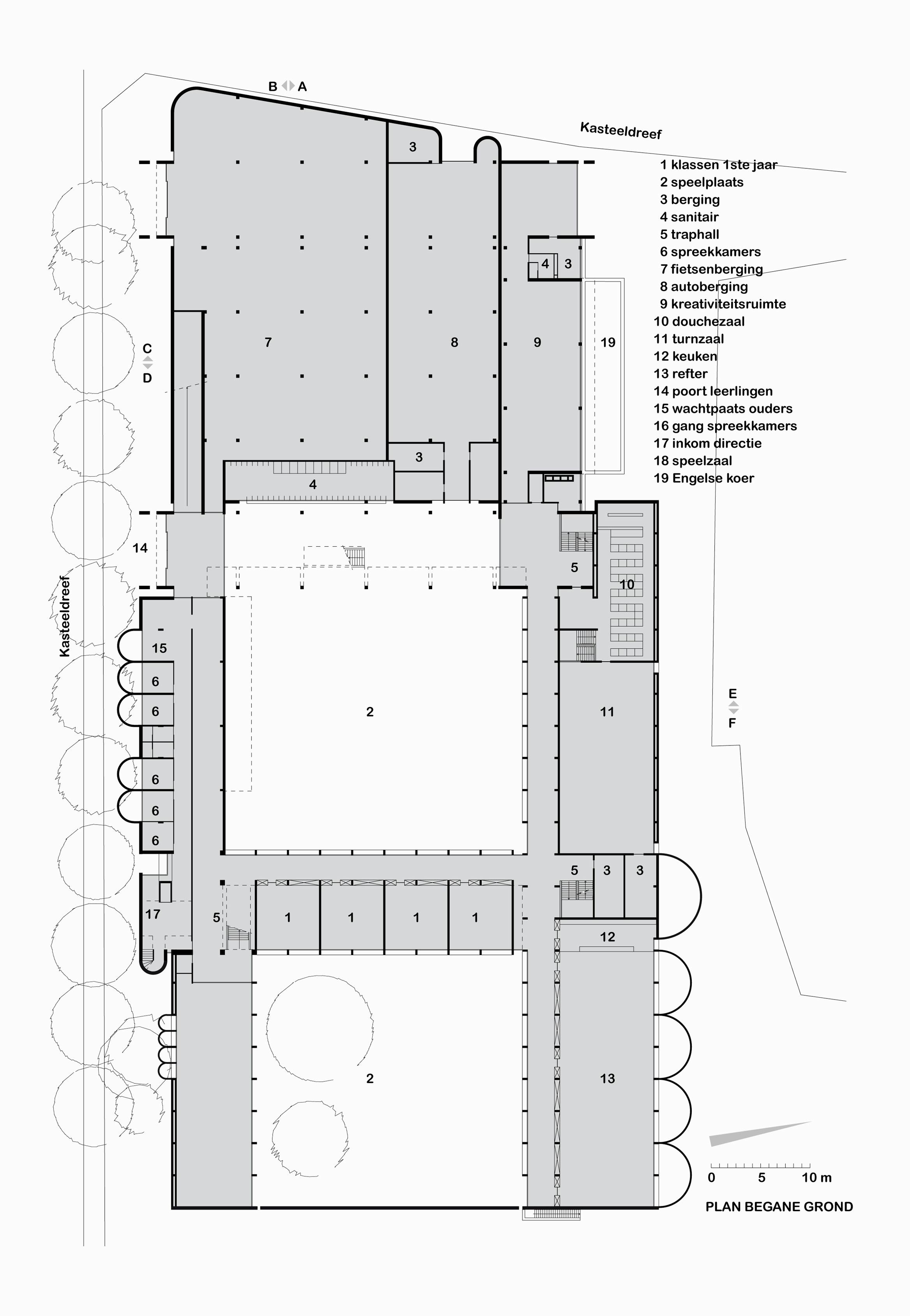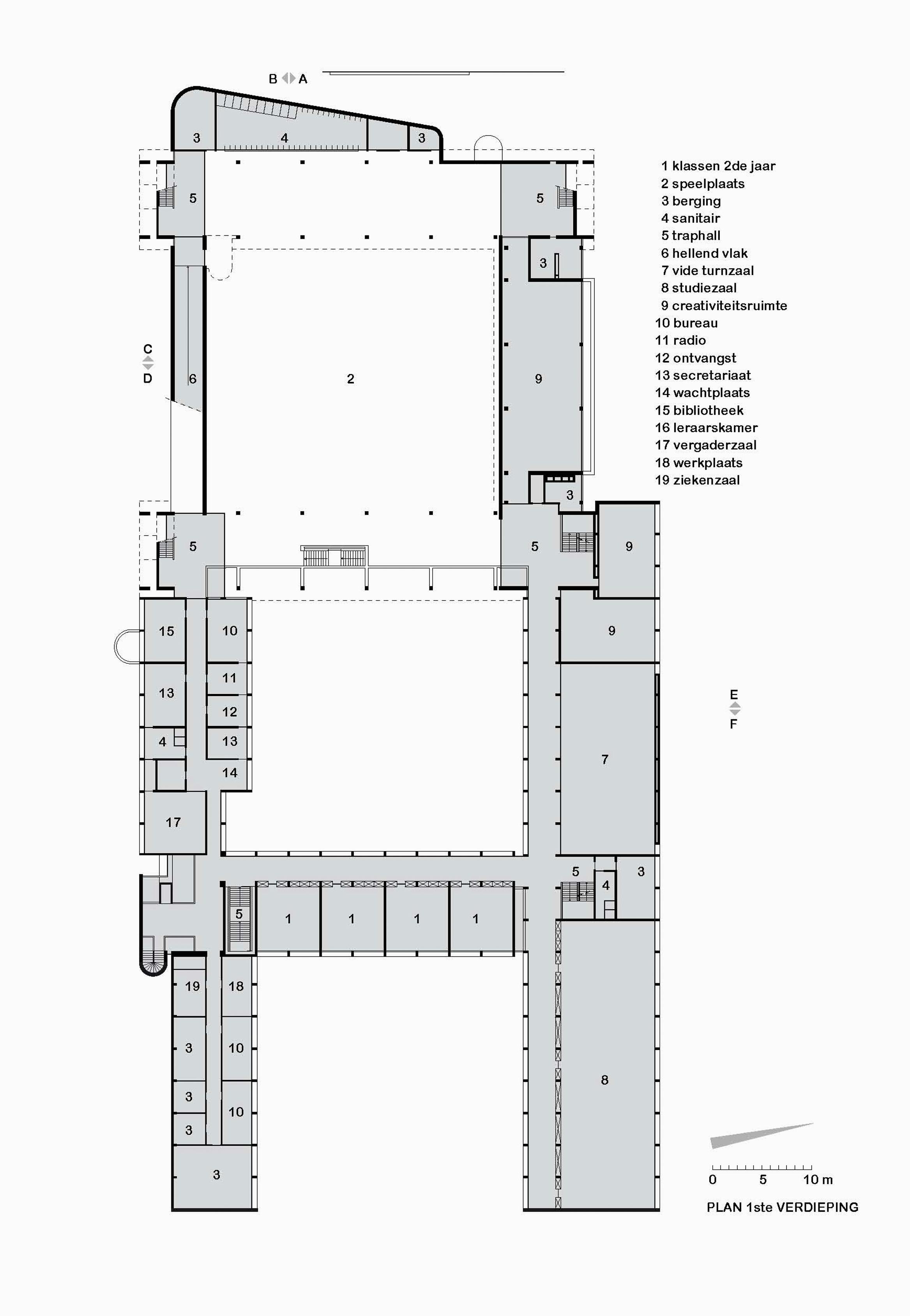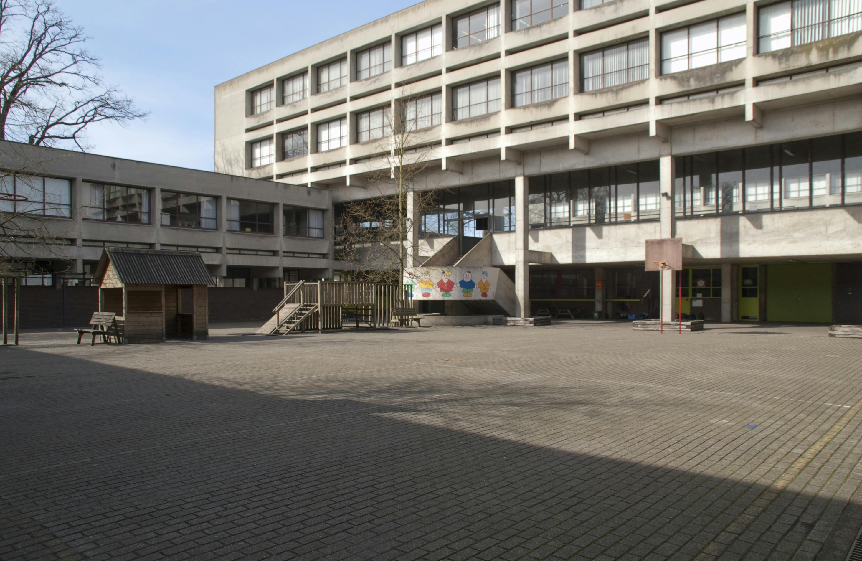 De drie speelplaatsen uit het masterplan, waarvan één op de eerste verdieping boven de auto- en fietsenstalling en één in het gebouw, werden behouden. De achtentwintig klassen van de hoogste jaren bevinden zich in een U-vorm op de tweede en derde verdieping. In alle hoeken bevinden zich trappen. De klasgroepen van de laagste graad bevinden zich op het gelijkvloers en op de eerste verdieping.