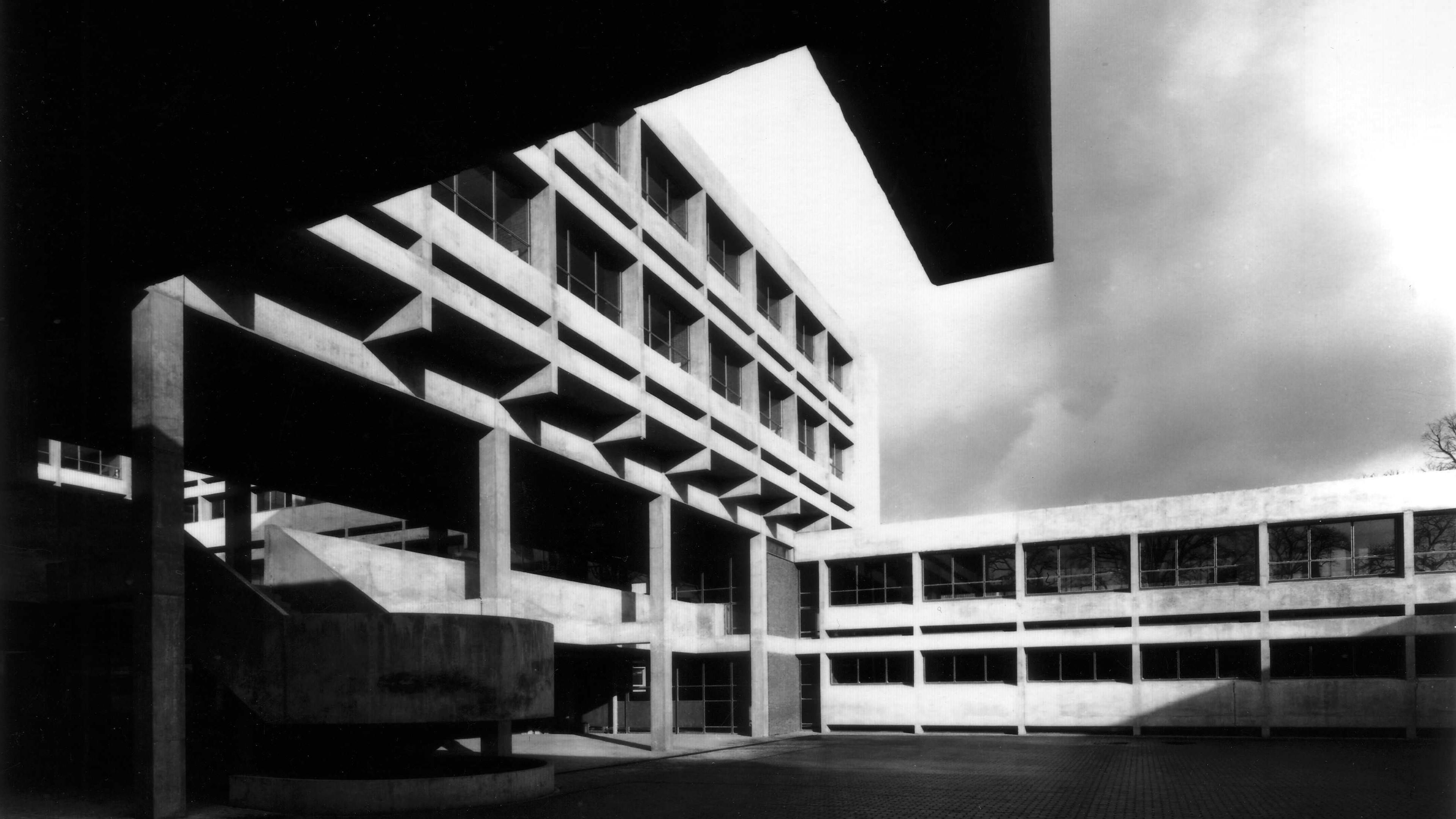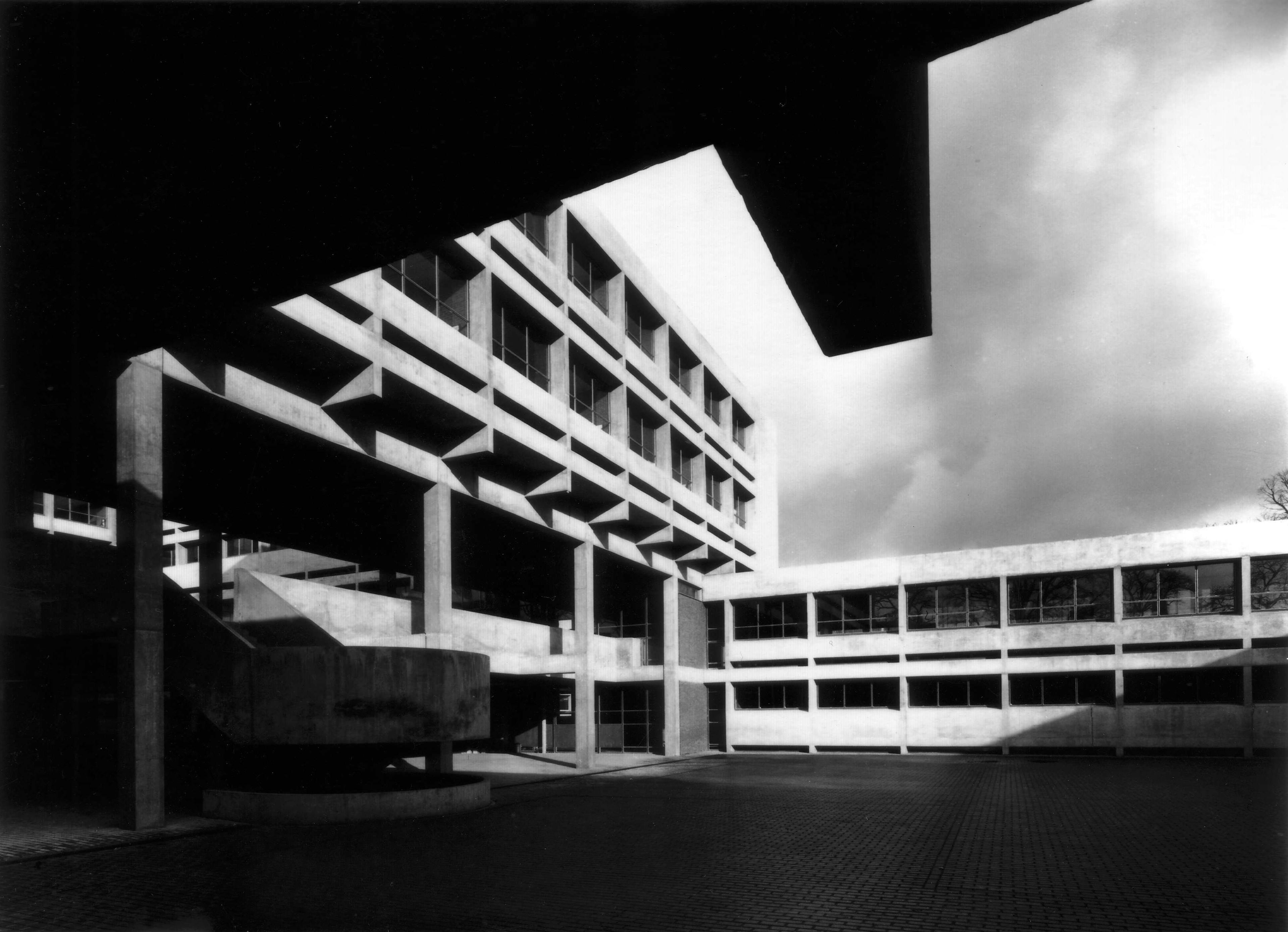 Het volumespel van de uitkragende gevels en van het middelste bouwblok op kolommen wordt in het ontwerp gecombineerd met de zwaarte van beton. Le Corbusier deed net hetzelfde in het klooster Sainte-Marie de la Tourette, hét voorbeeld van de brutalistische architectuur gebaseerd op zijn visionaire manifest Vers une architecture waarin hij de drie basisbegrippen uitlicht: