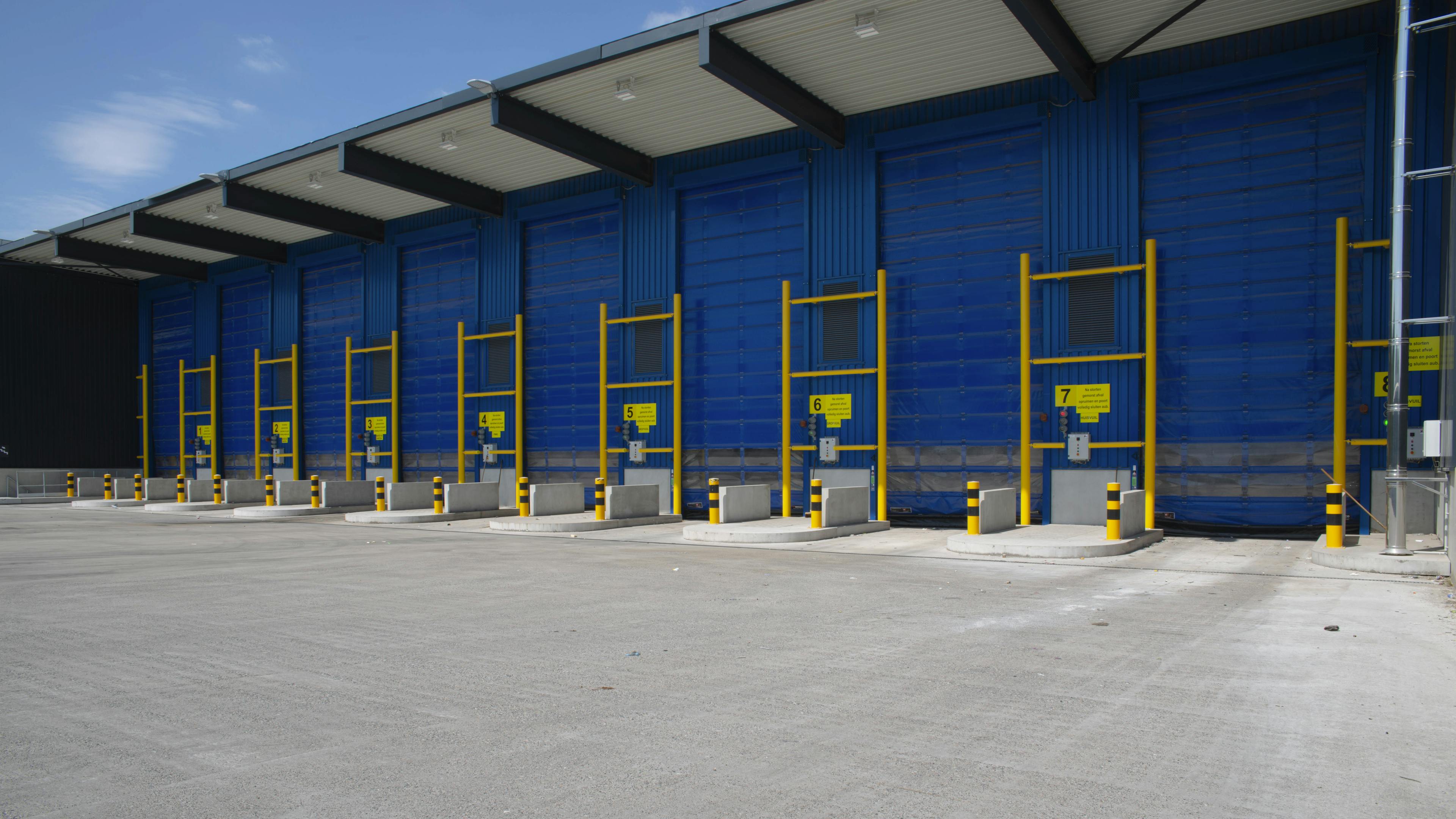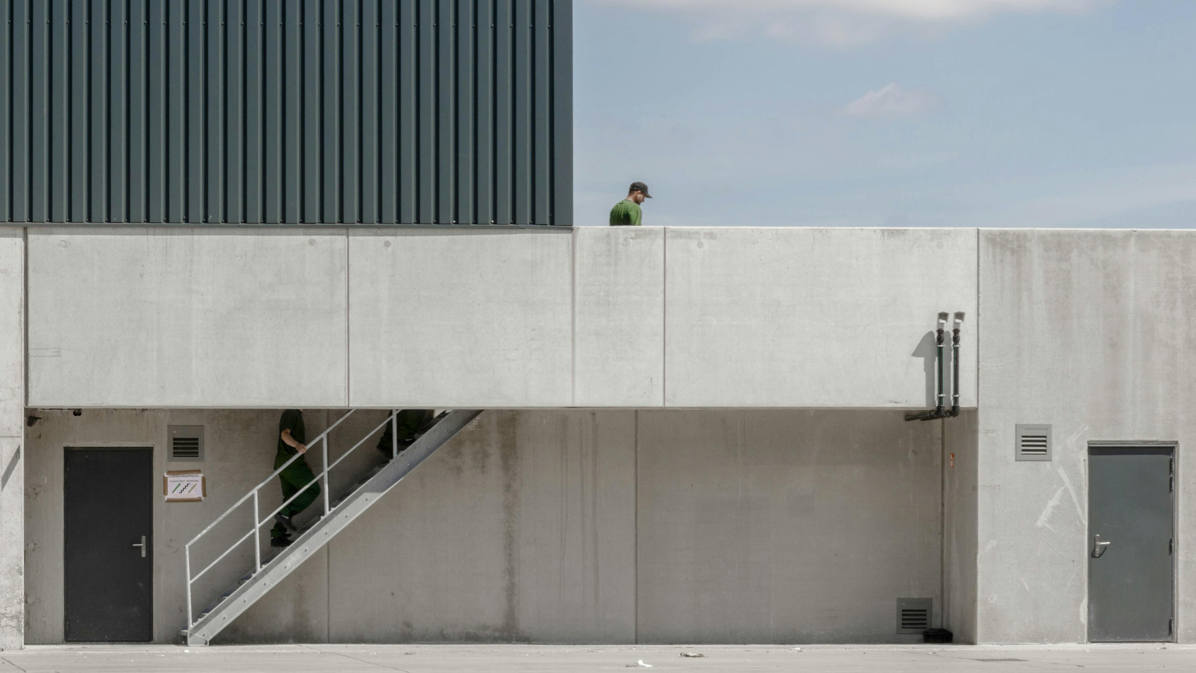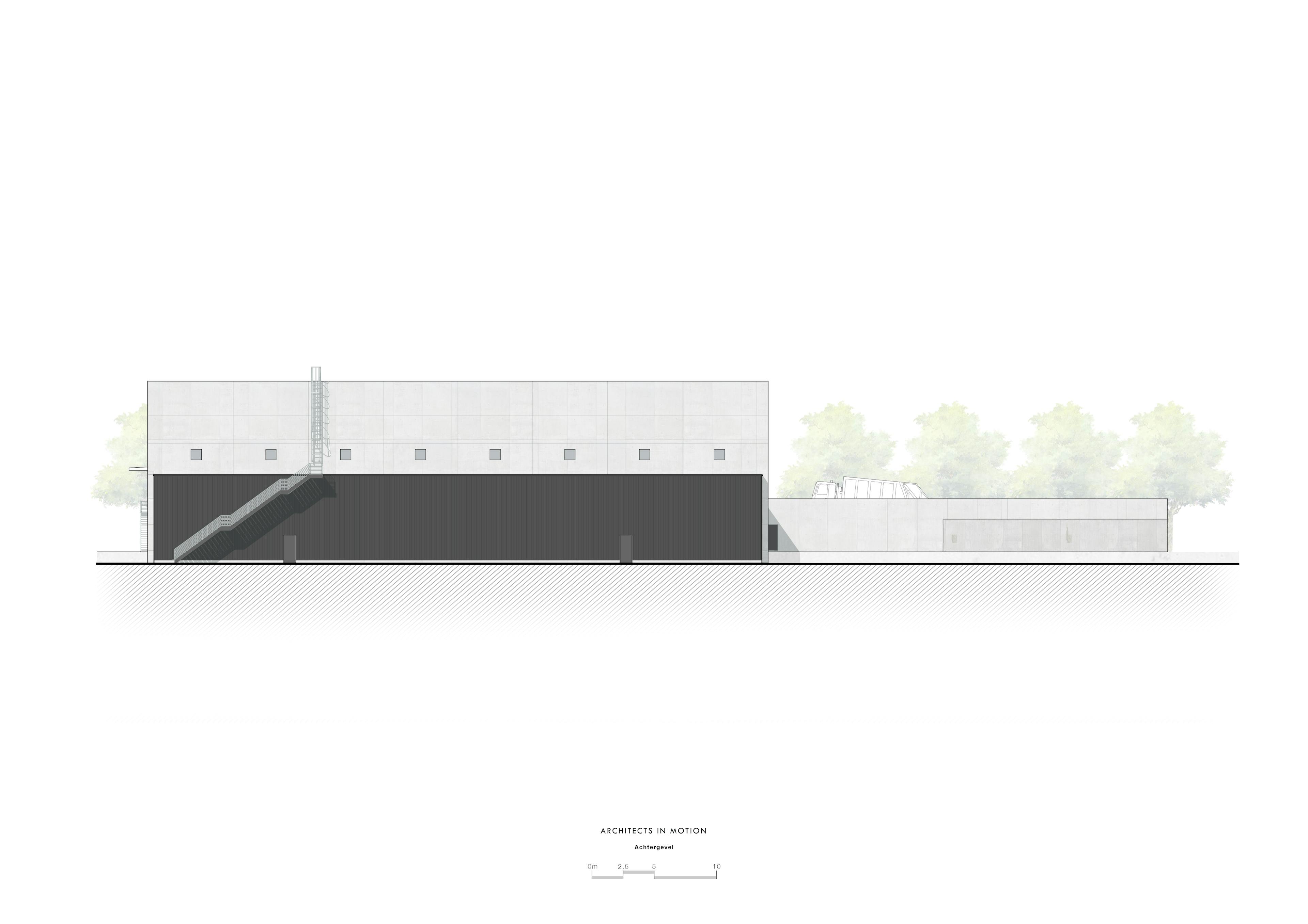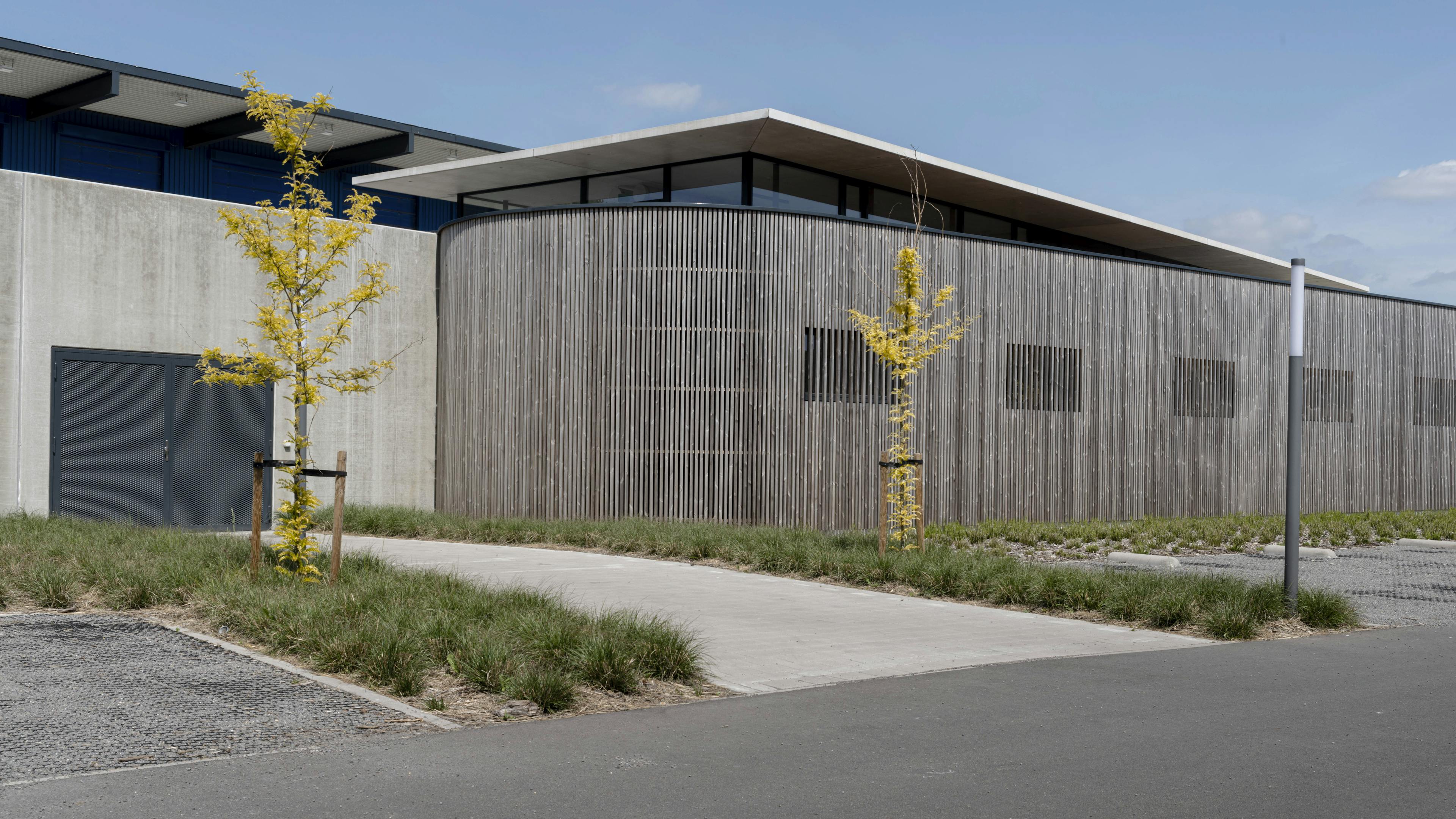De gevels zijn uitgevoerd in prefabbeton en bardageplaten uit staal.