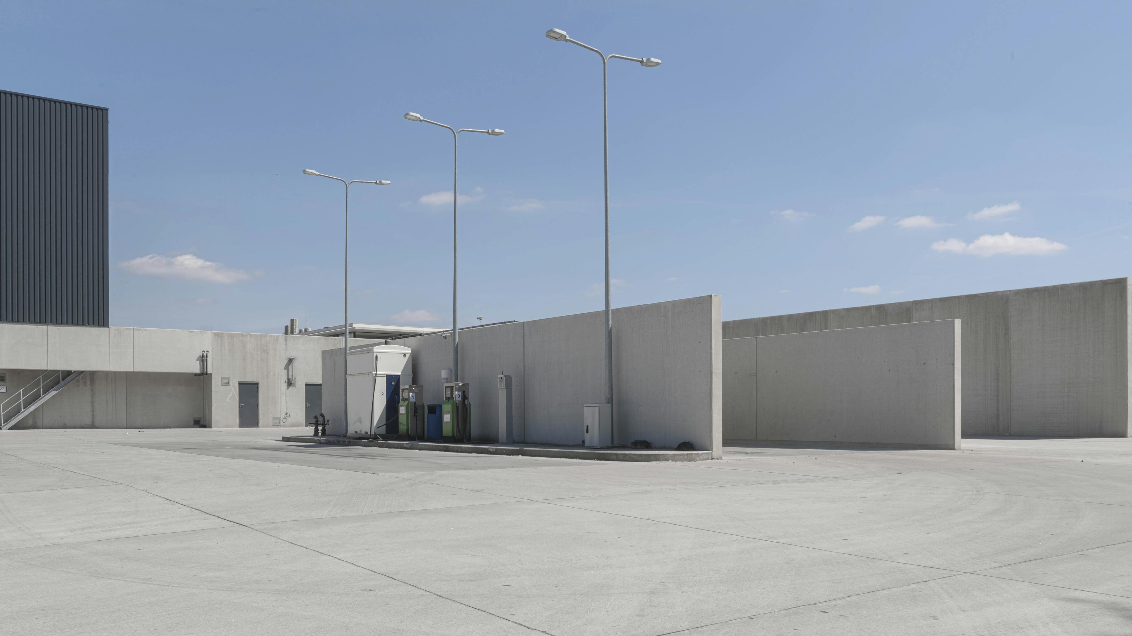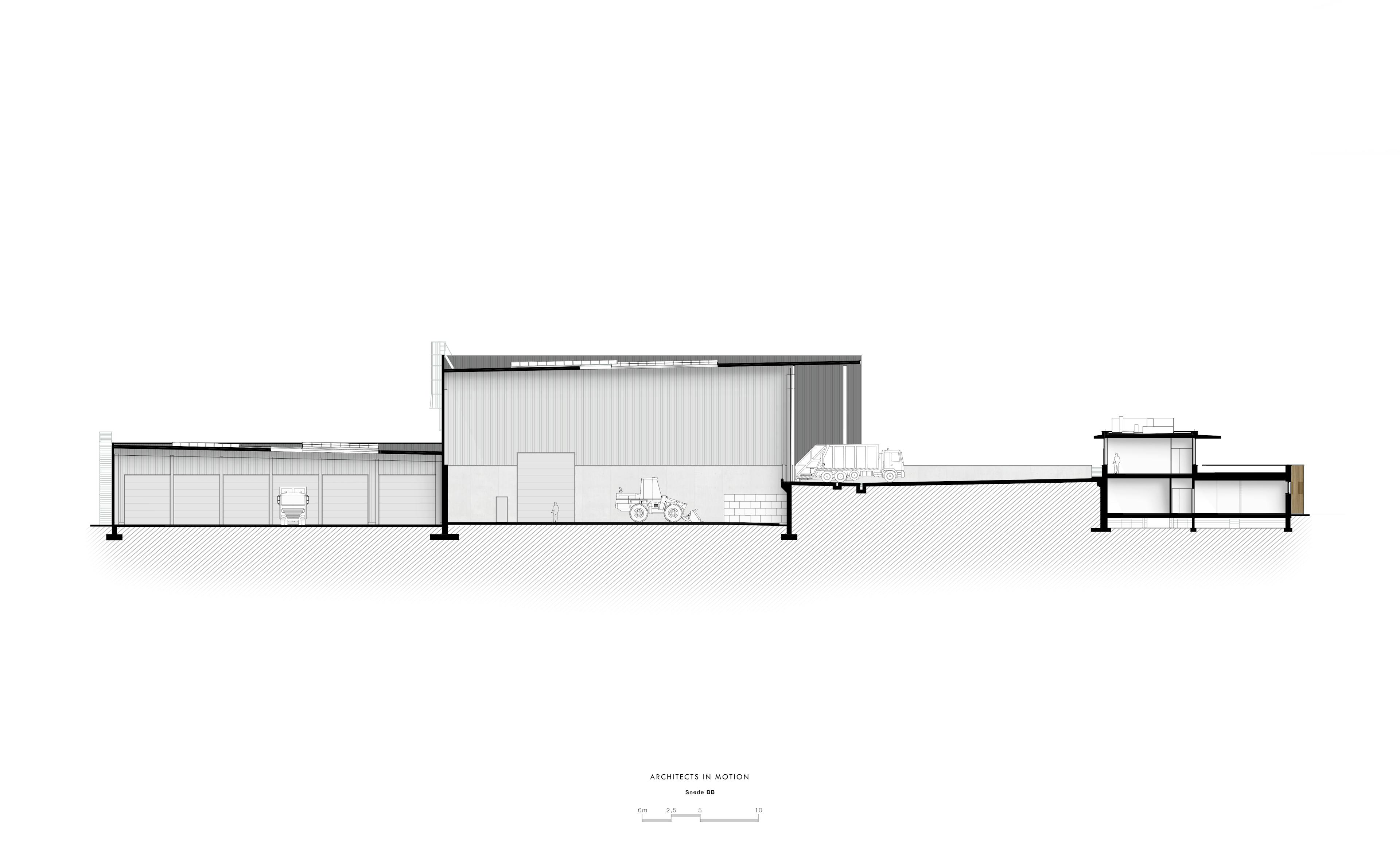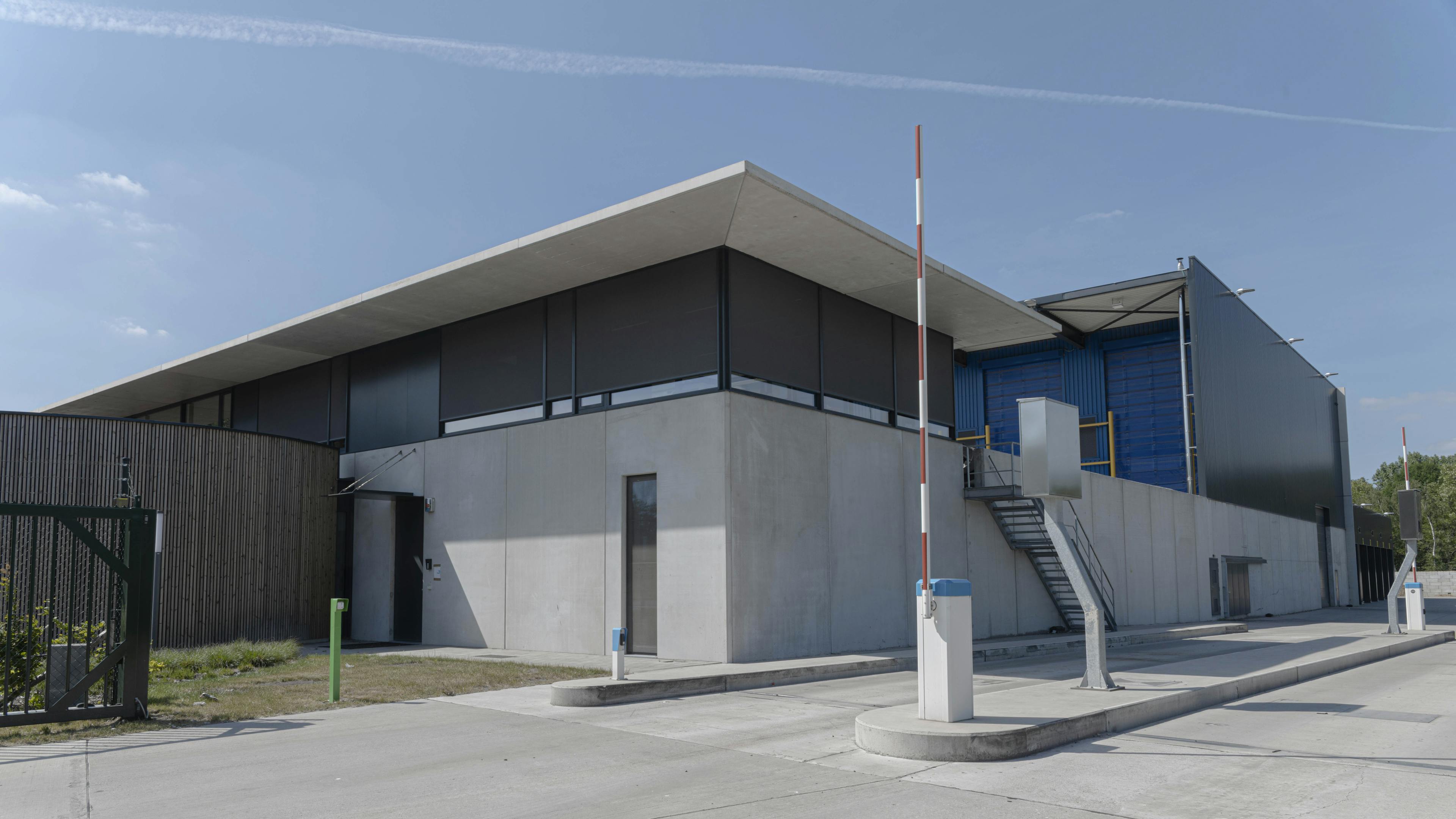 Een immense betonnen wand is de gematerialiseerde grens tussen de industriële bedrijvigheid en de groene ‘buitenwereld’. Door de wand ook aan de zijkant van het gebouw verder te laten lopen, creëert de ontwerper een sokkel in de vorm van een betonnen doos. Een met hout bekleed, afgerond en volledig gesloten volume verzacht de grens en geeft de site samen met de betonnen doos zijn identiteit. In dat houten volume bevinden zich de kleedkamers. Links naast het volume kom je via de dubbele poort bij de fietsenberging en de motorenstelplaats. Een origineel detail is dat men aan een droogkamer voor regenkledij heeft gedacht, een leuke attentie voor motorrijders die regenweer hebben moeten trotseren. Aan de rechterkant van het volume verleent een deur je toegang tot de inkomhal die met een trap rechtstreeks toegang biedt tot de dispatching op de eerste verdieping. Als een arendsnest ligt de dispatchruimte op een zeer strategische plaats in het gebouw en heb je van hieruit een perfect zicht over de toegangszone van de site. Verder bevinden zich op de verdieping een kitchenette, een eetruimte met dakterras voor het personeel. Om de betonnen ‘doos’ van het gelijkvloers te accentueren en te versterken is de volledige verdieping uitgevoerd met aluminium schrijnwerk en glas. De horizontaliteit van het ver overstekende dak onderstreept het bijzondere karakter van het ‘poortgebouw’.