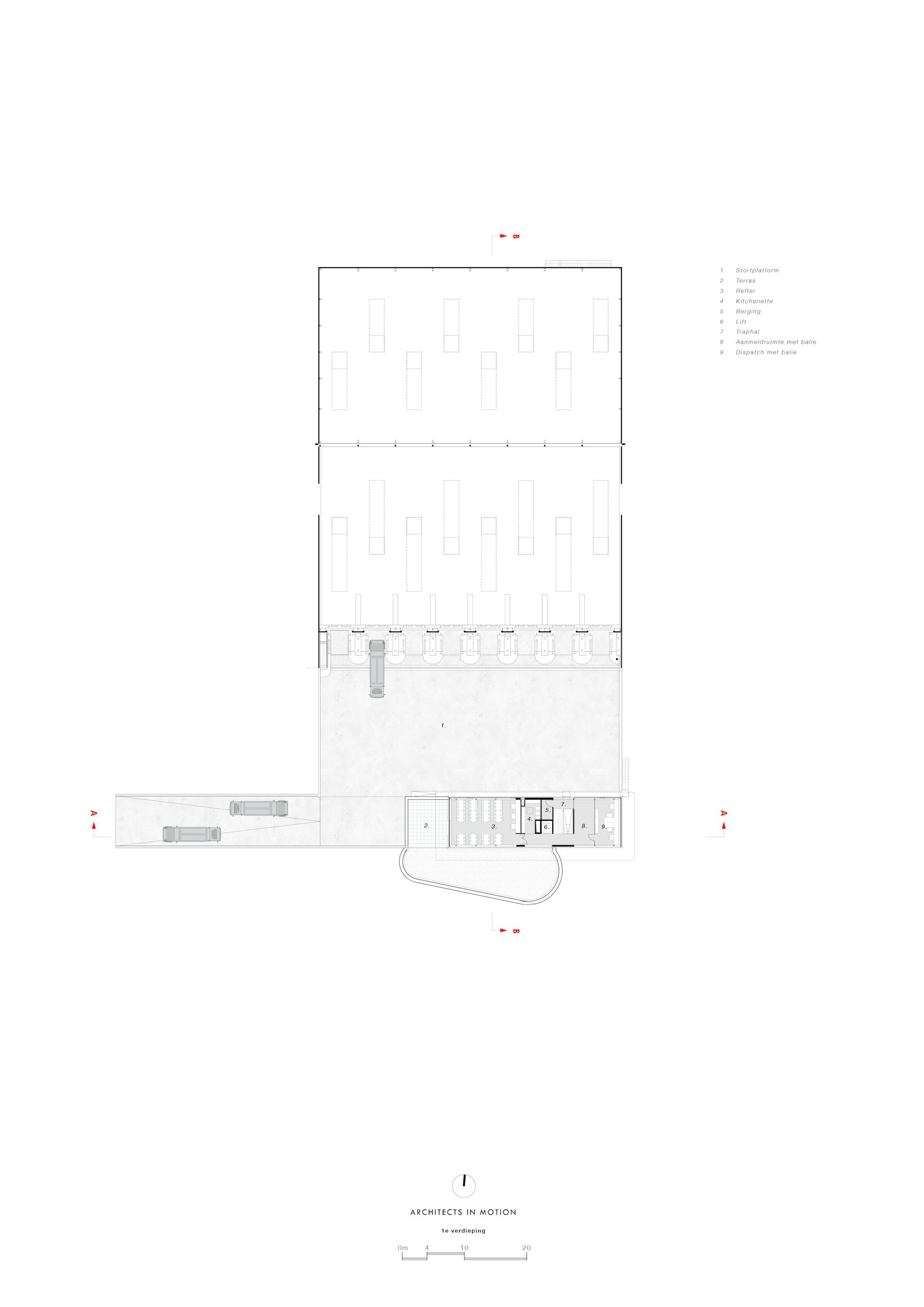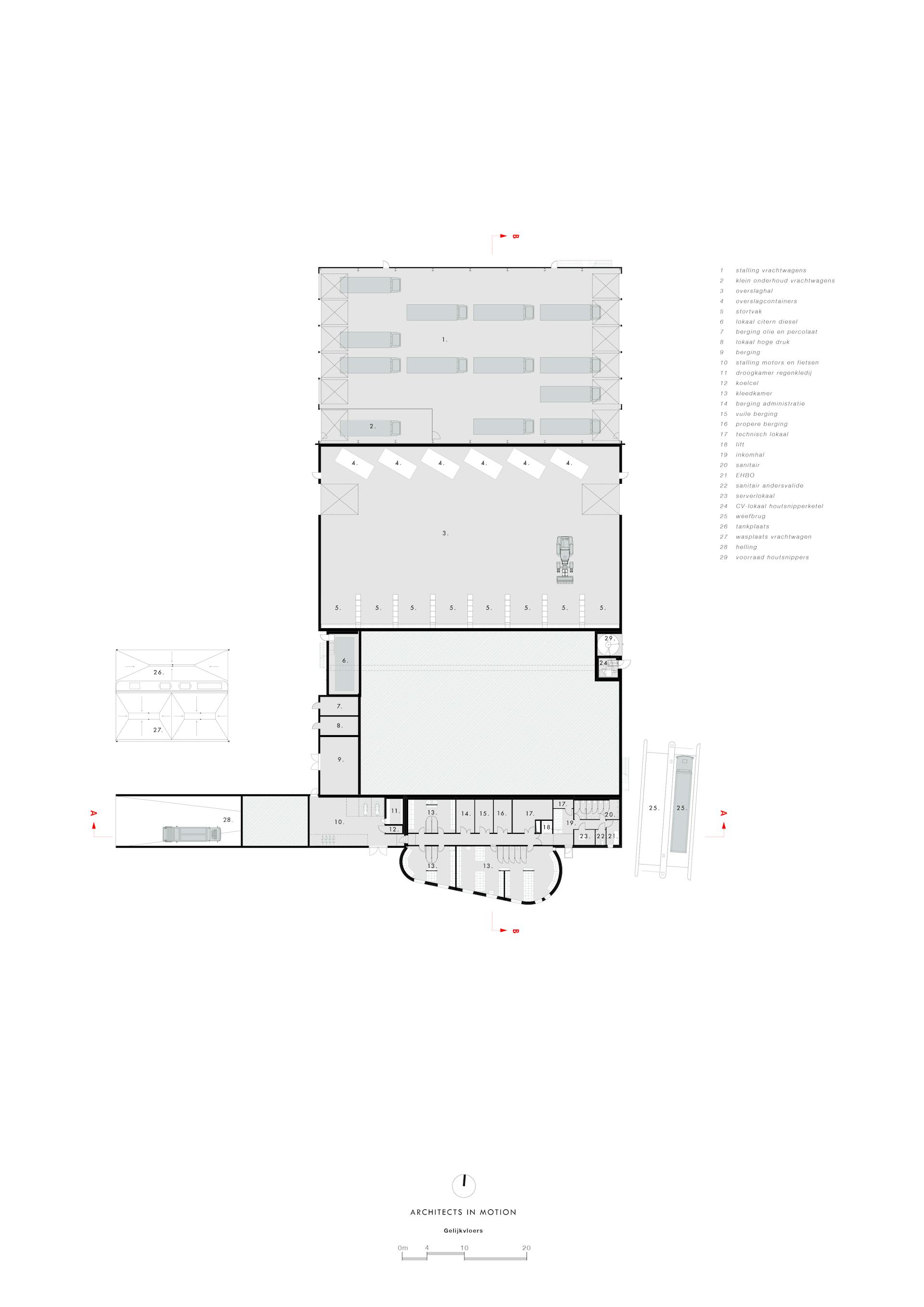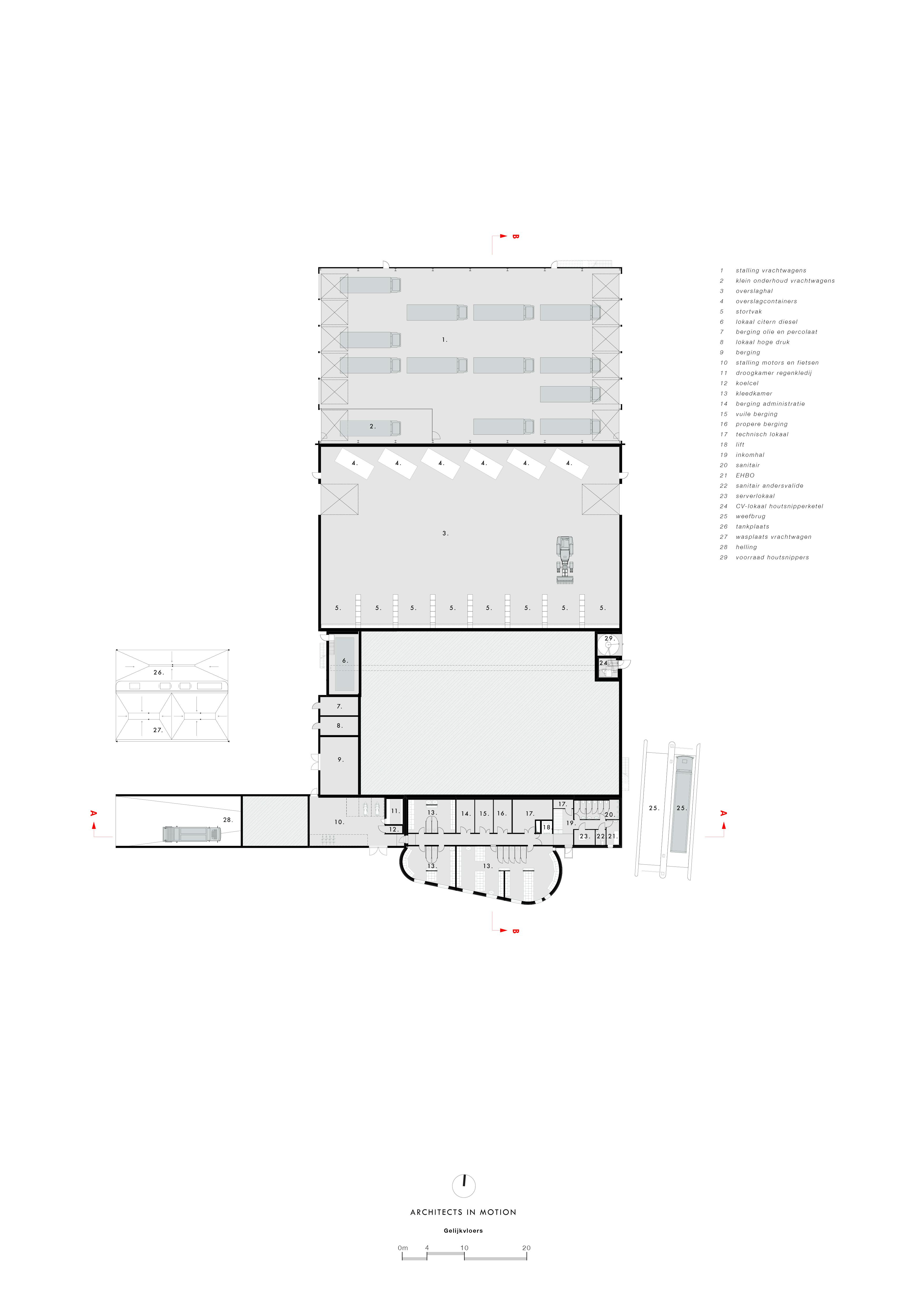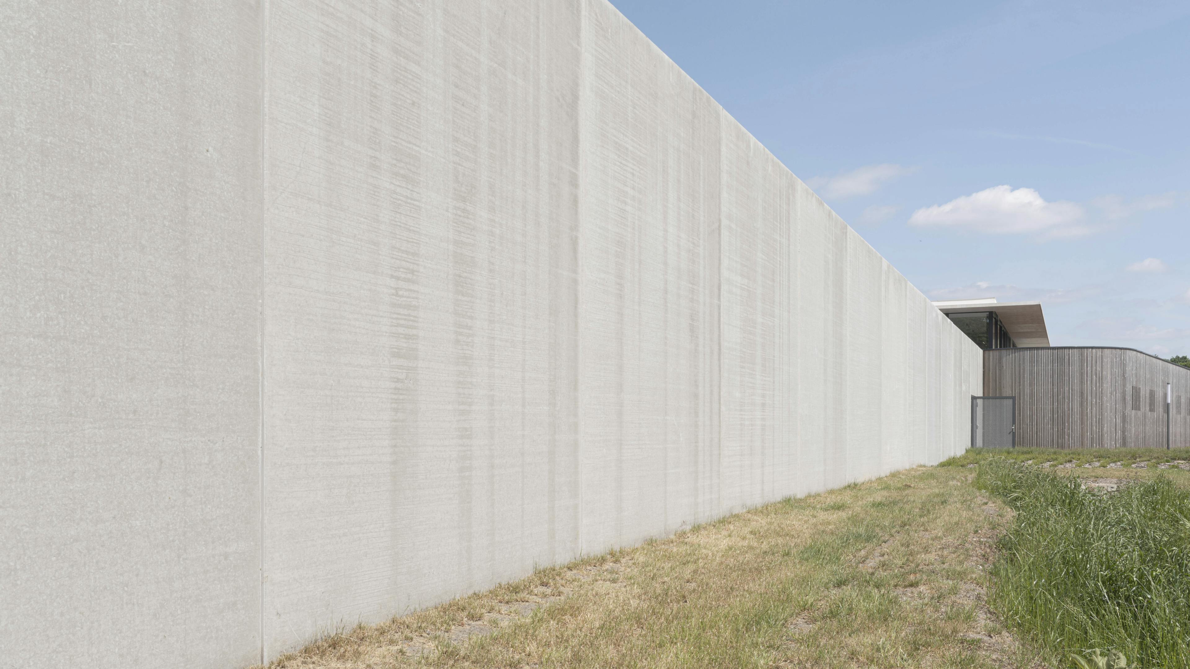 Een immense betonnen wand is de gematerialiseerde grens tussen de industriële bedrijvigheid en de groene ‘buitenwereld’. Door de wand ook aan de zijkant van het gebouw verder te laten lopen, creëert de ontwerper een sokkel in de vorm van een betonnen doos. Een met hout bekleed, afgerond en volledig gesloten volume verzacht de grens en geeft de site samen met de betonnen doos zijn identiteit. In dat houten volume bevinden zich de kleedkamers. Links naast het volume kom je via de dubbele poort bij de fietsenberging en de motorenstelplaats. Een origineel detail is dat men aan een droogkamer voor regenkledij heeft gedacht, een leuke attentie voor motorrijders die regenweer hebben moeten trotseren. Aan de rechterkant van het volume verleent een deur je toegang tot de inkomhal die met een trap rechtstreeks toegang biedt tot de dispatching op de eerste verdieping. Als een arendsnest ligt de dispatchruimte op een zeer strategische plaats in het gebouw en heb je van hieruit een perfect zicht over de toegangszone van de site. Verder bevinden zich op de verdieping een kitchenette, een eetruimte met dakterras voor het personeel. Om de betonnen ‘doos’ van het gelijkvloers te accentueren en te versterken is de volledige verdieping uitgevoerd met aluminium schrijnwerk en glas. De horizontaliteit van het ver overstekende dak onderstreept het bijzondere karakter van het ‘poortgebouw’.