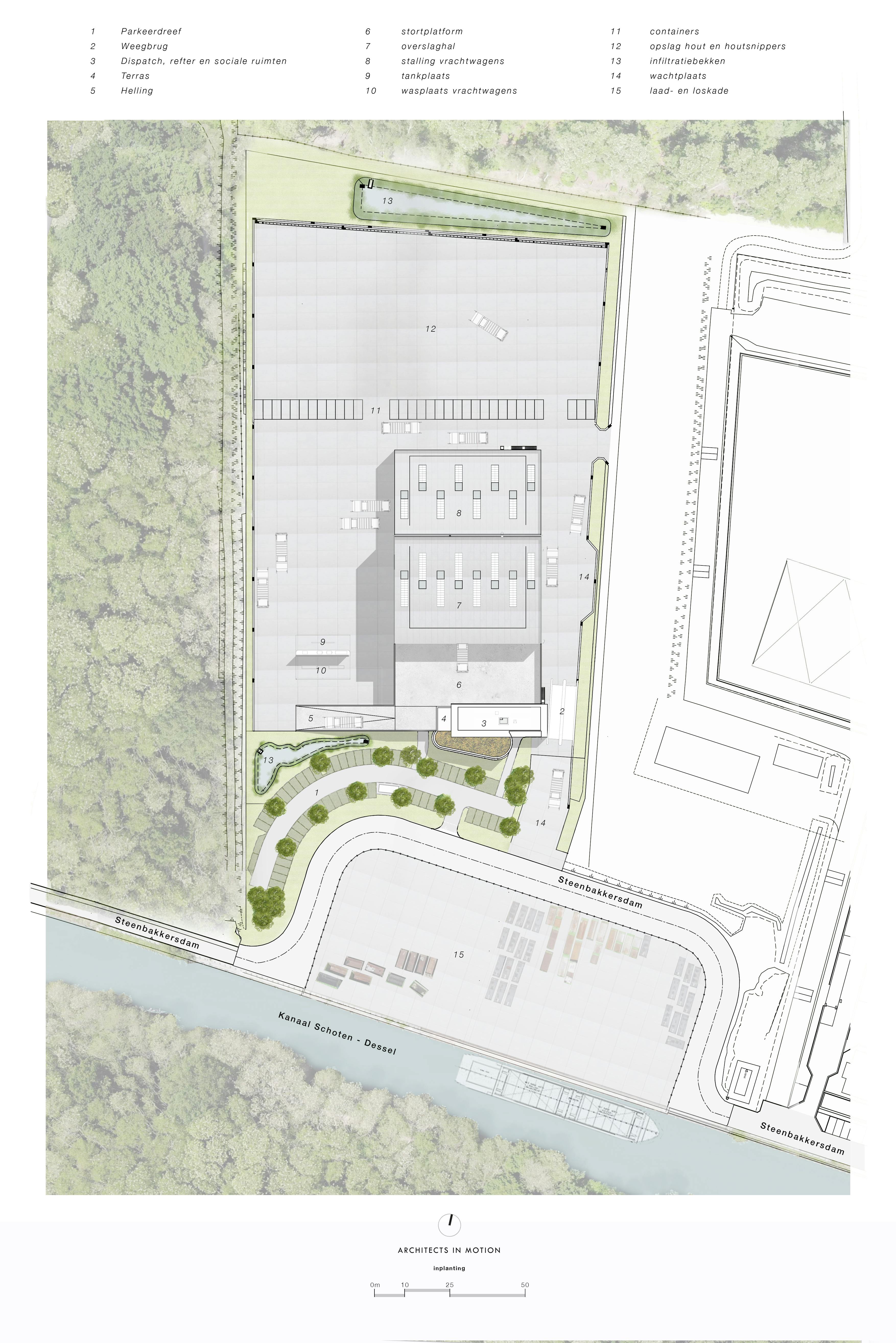 De Steenbakkersdam geeft je toegang tot de site, enerzijds voor traag verkeer en personenwagens via de ‘parkeerdreef’ en anderzijds - voor de vrachtwagens - langs een wachtplaats en een oprit die de vrachtwagens naar de weegbruggen, die rechts naast het gebouw zijn ingeplant, begeleidt. Voetgangers, fietsers en personenwagens worden meteen naar de parkeerdreef afgeleid en voorkomen al te veel contact met het zware verkeer. De parkeerdreef vormt de overgang tussen de openbare weg en het openbaar groen naar de verharde site. Auto’s worden geparkeerd op grasdallen en zowel de vorm van de dreef als de afwisseling verharding/beplanting maken de overgang organisch. Ze vormt het verlengde van de natuurlijke en het begin van de bebouwde omgeving.