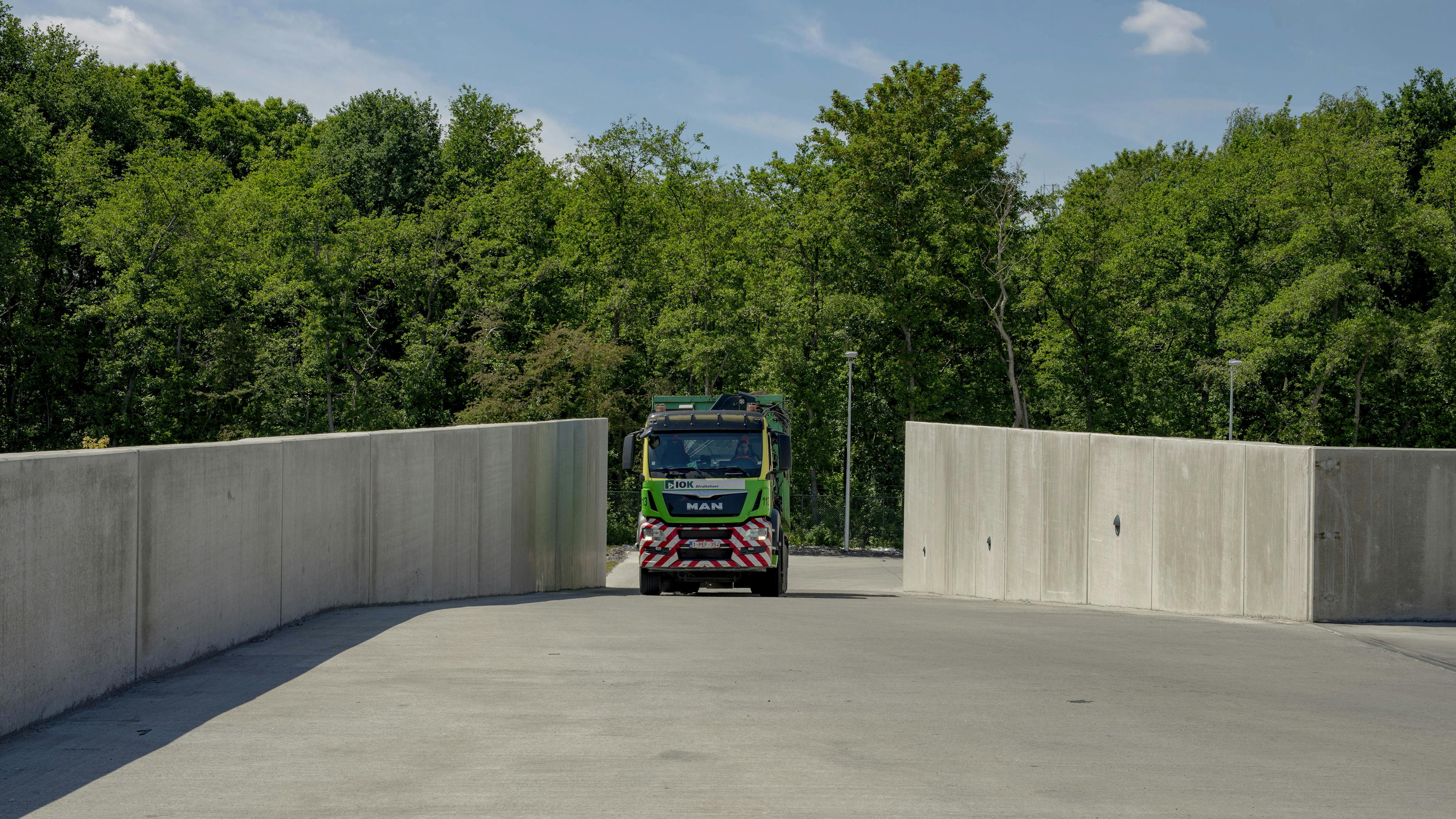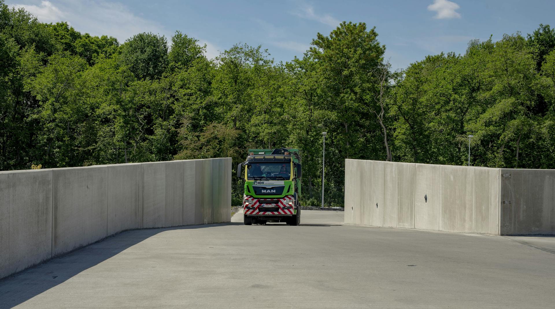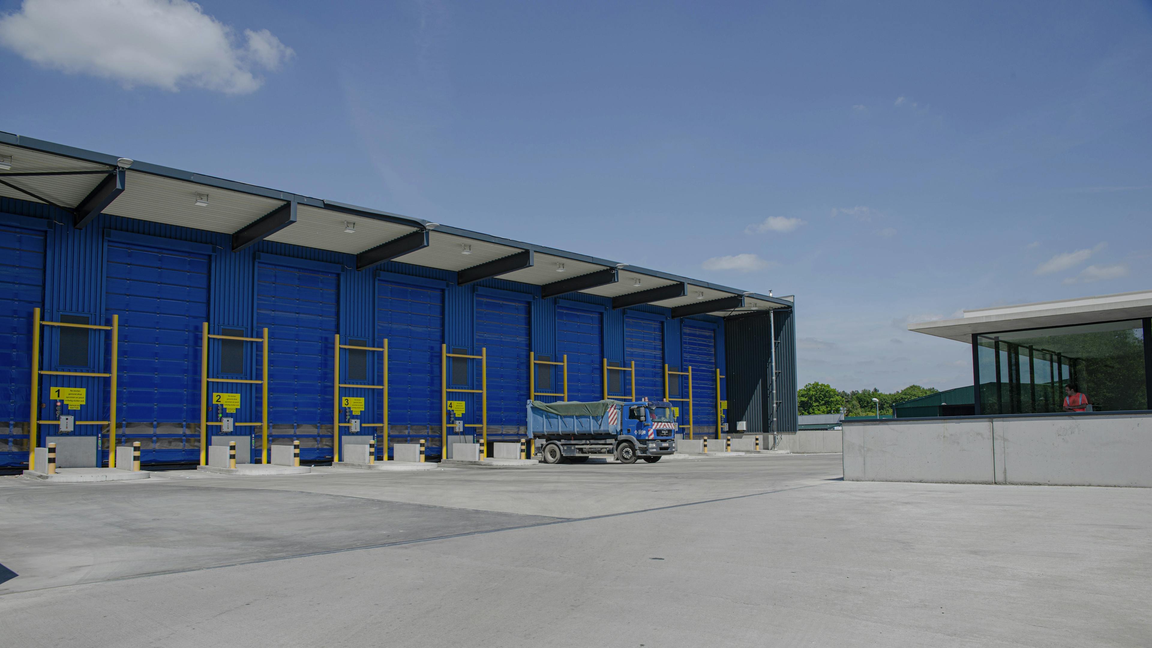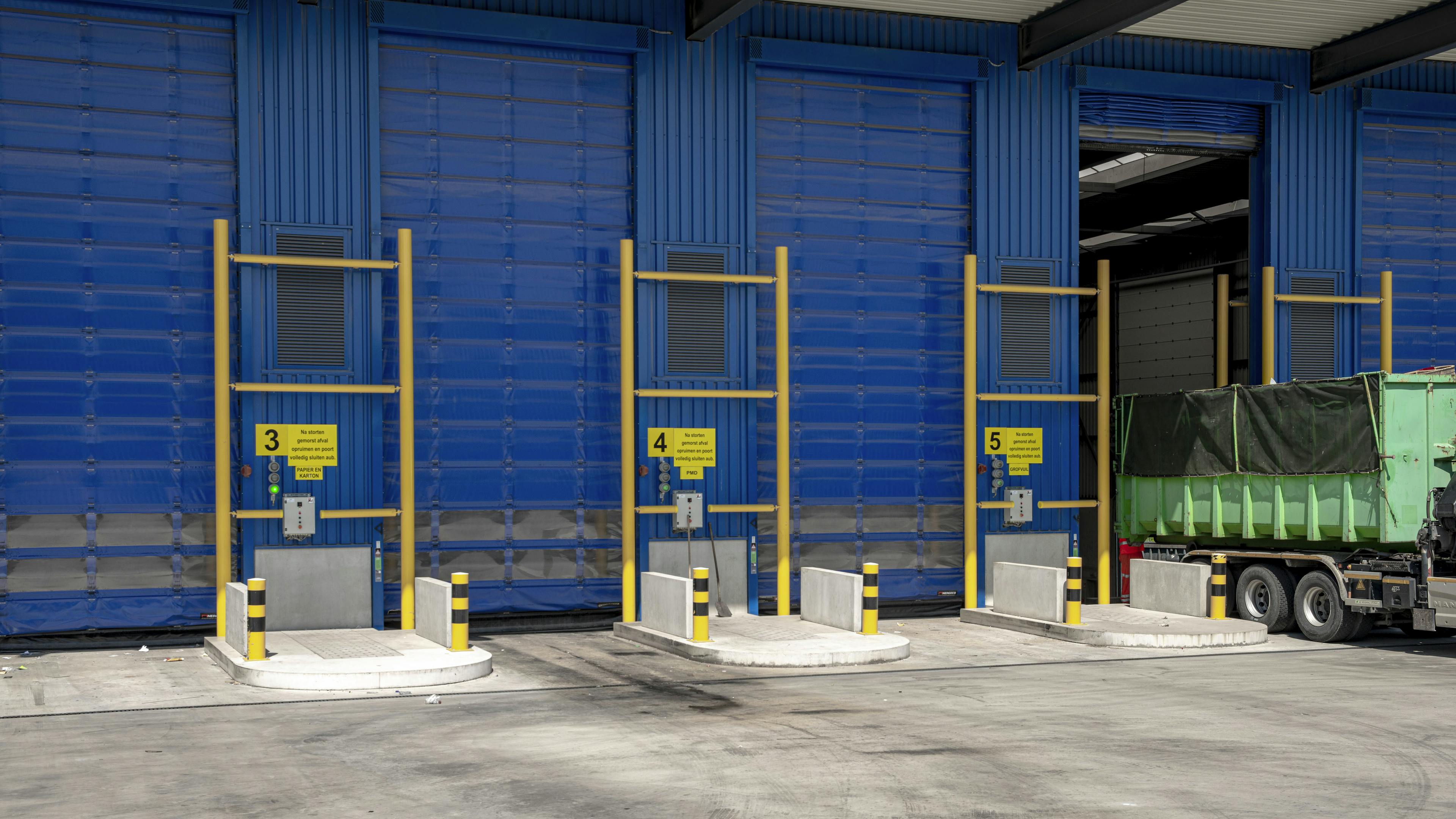 Eens de weegbruggen gepasseerd, rijden de vrachtwagens op een ‘ringweg’ rond het gebouw waar ze langs een stockageplaats voor containers en opslag voor hout en houtsnippers de binnenkoer oprijden, waarlangs ze via een helling op het stortplatform terechtkomen. Daar kunnen ze de inhoud van hun vracht rechtstreeks via grote poorten in de overslaghal storten. Elke poort geeft toegang tot een gesorteerde stortplaats: papier/karton, PMD, huisvuil, grofvuil, … In die hal, waarvan de wand van de stortvakken bekleed is met een stootvaste metalen bardage, rijden bulldozers op en aan om het afval in overslagcontainers te deponeren. Aanpalend aan de overslaghal is een grote hal ontworpen voor de stalling van de vrachtwagens. Onder het stortplatform zijn functionele ruimtes zoals stookruimte, opslagruimte voor houtsnippers, bergingen voor diesel, olie en percolaat en een compressorlokaal ondergebracht. Op de binnenkoer kunnen de vrachtwagens gereinigd en volgetankt worden. Met de organisatie van het ontwerp en een uitgekiende inplanting van de verschillende diensten en functies met bijhorende verkeersflow, voorkomt men ook hier vermenging van voetgangers- en vrachtwagenverkeer.