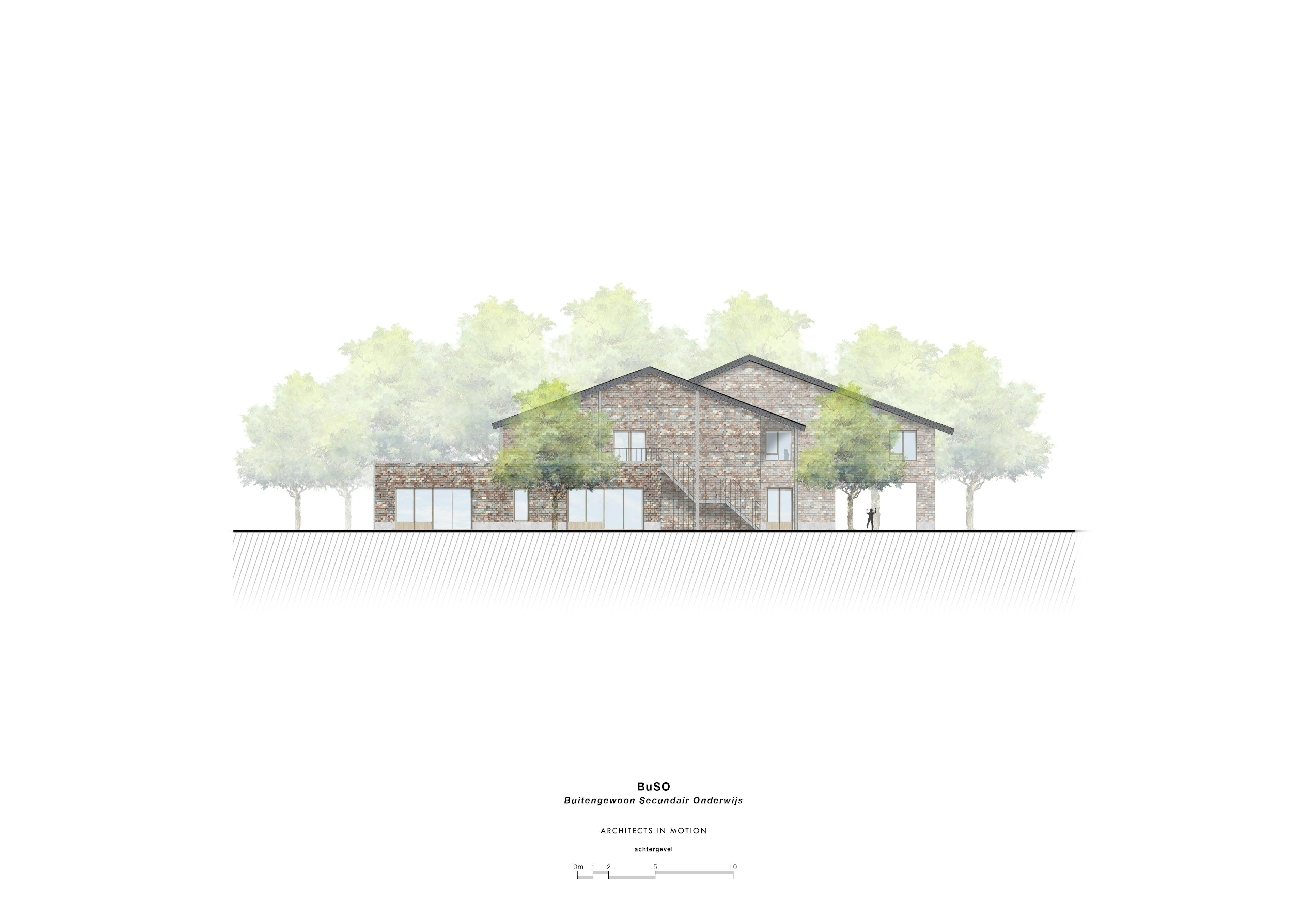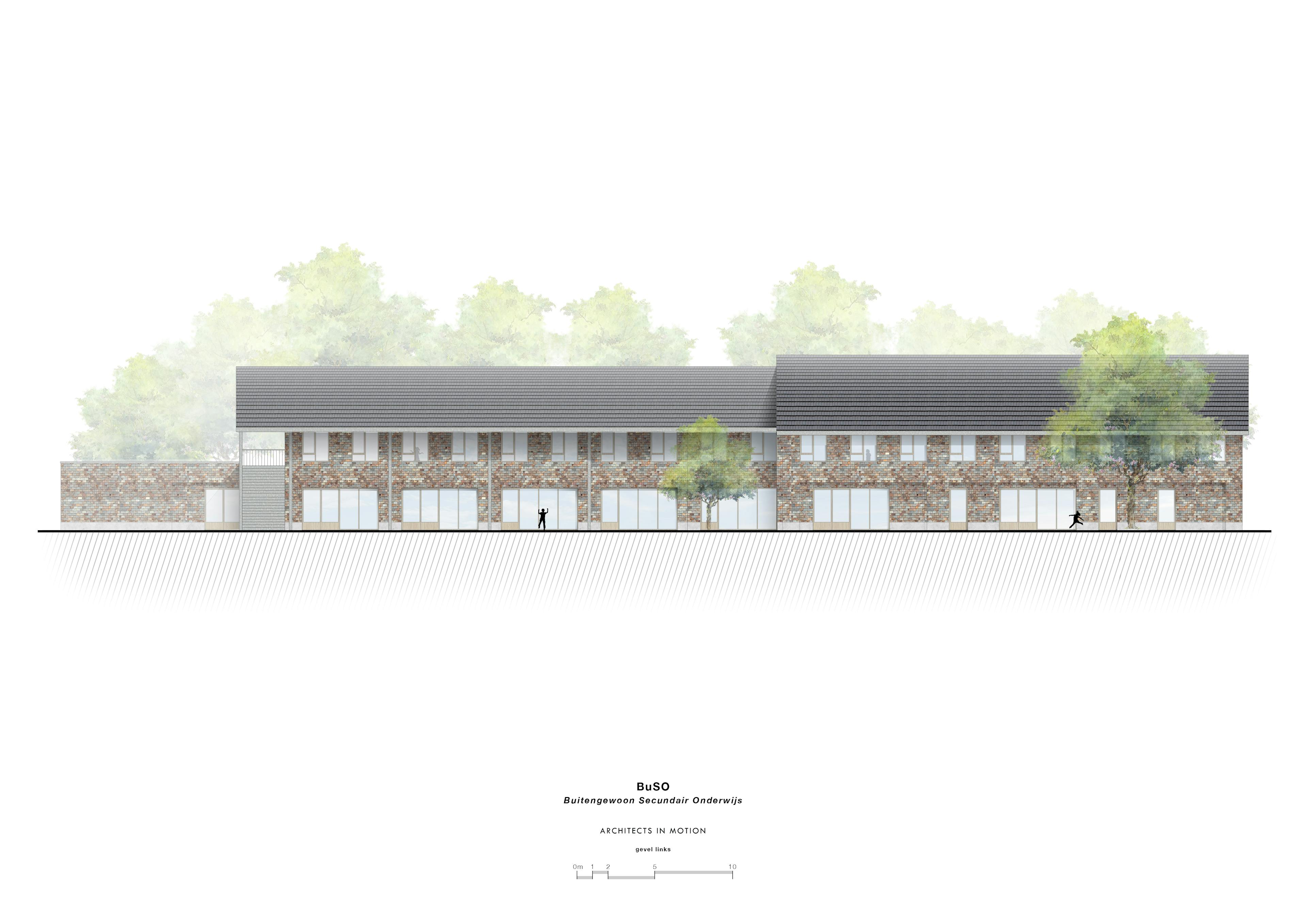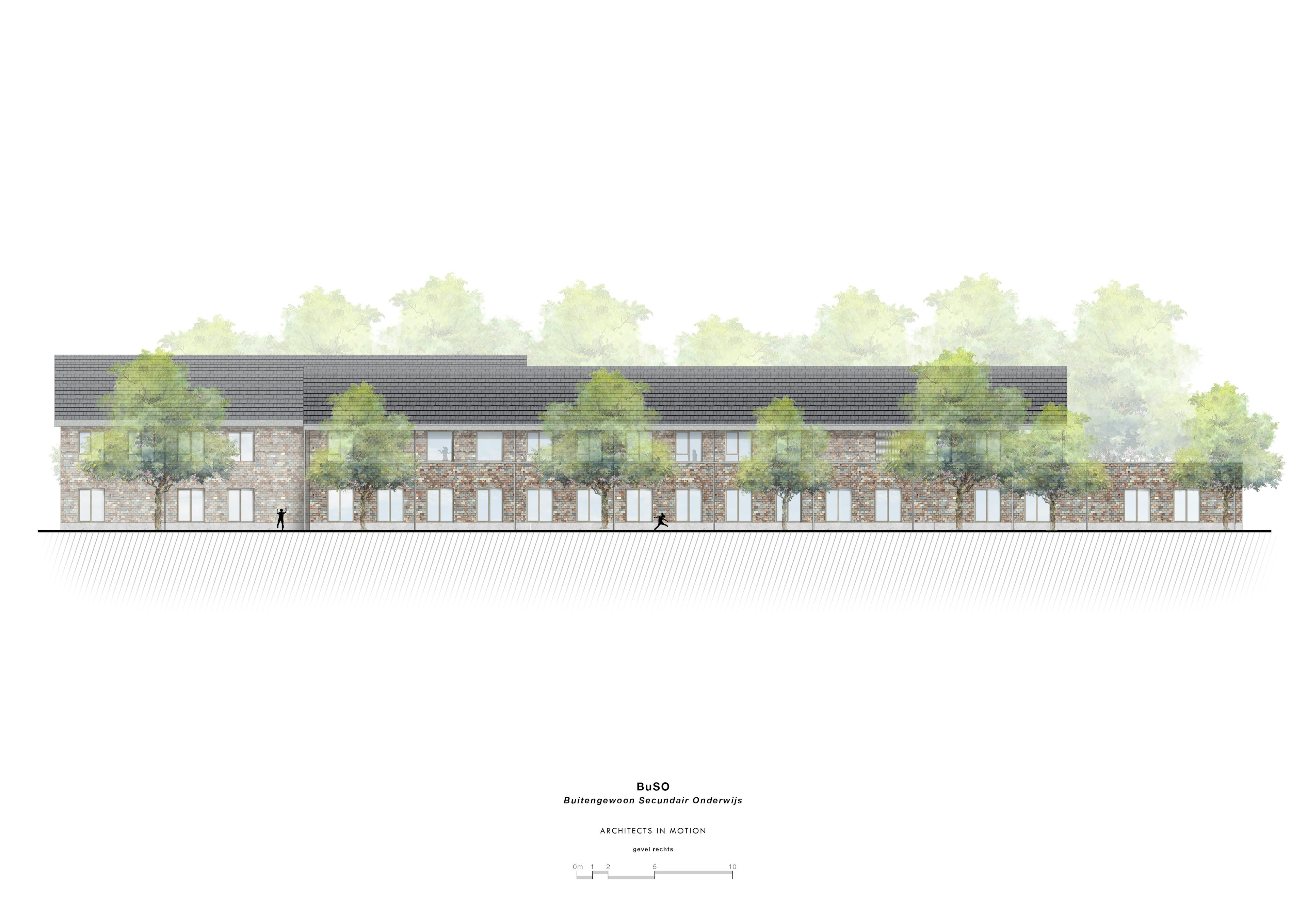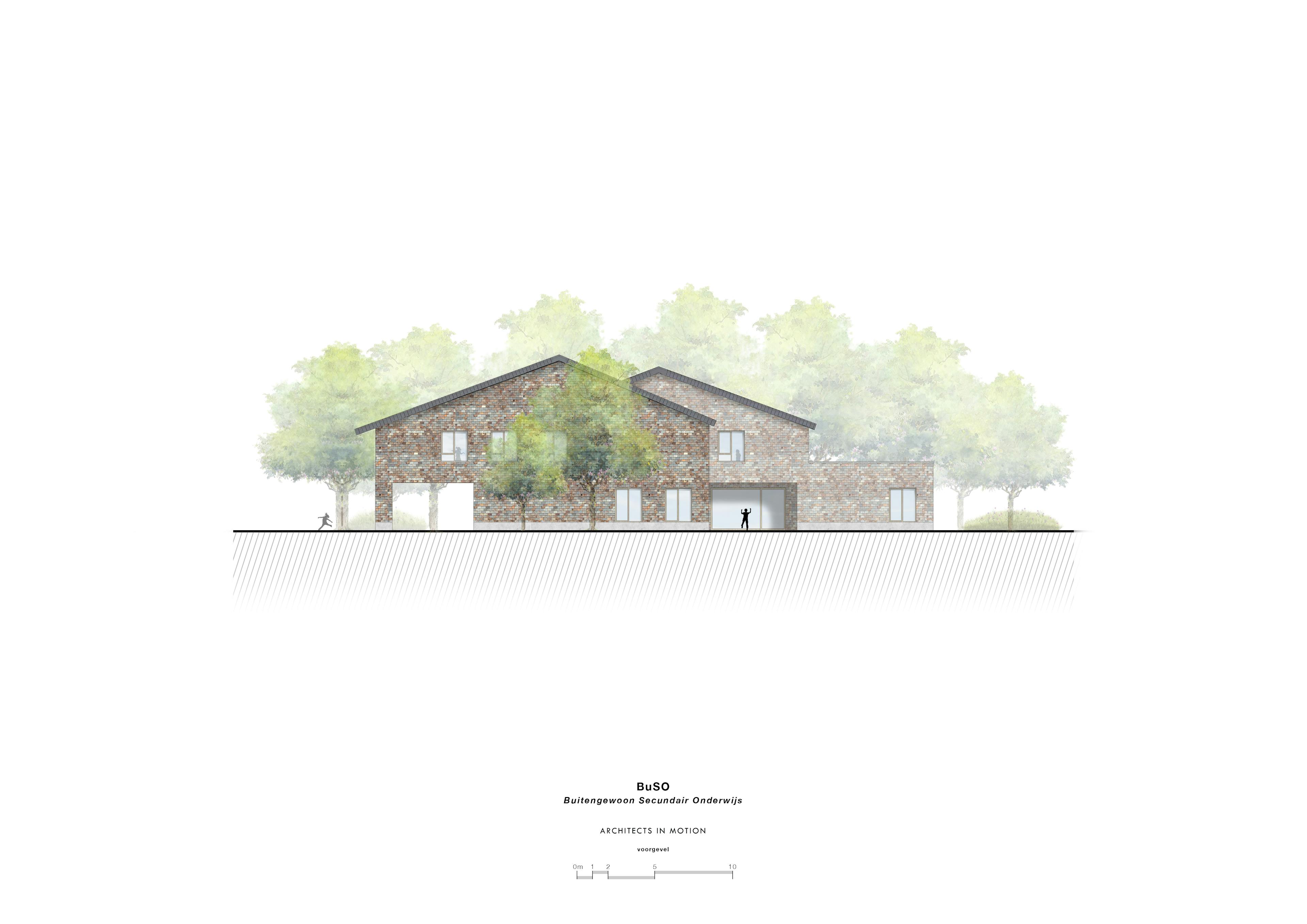 Architects in Motion toont aan dat de architectuurpraktijk meer is dan enkel ontwerpen van gebouwen en begeleiden van een bouwproces. Voeling met de opdracht, (er)kennen van de noden van de klant, inleving in de historiek van het project, optimaliseren van de financiële situatie waarin een project vorm krijgt, toekomstgericht anticiperen op mogelijke evoluties,… Rekening houden met deze diversiteit aan prolegomena resulteert in een correcte definitie van en duidelijk inzicht in de noden van de klant. Samen met OM/AR en Omgeving ontwierp AIM de eerste fase van een project dat ingebed is in een complexe bestaande context. De centrale inplanting van de scholencluster op de site De Brem en het afbouwen van de satellietcampus De Ring openen perspectieven om de werking en de beleving van personeel, leerlingen, ouders en sympathisanten van VIBO te verbeteren. De keuze om met verschillende entiteiten te werken toont het respect dat de ontwerpers hadden voor het aanwezige groen en de kwaliteiten van het landschap. Het streven om de energieconsumptie en ecologische impact van het project te beperken door zo compact mogelijk te bouwen, zijn hiervan de gematerialiseerde getuigen. Door de buurt – de serviceflats en het woonzorgcentrum – maximaal te betrekken en de kwalitatieve groenzones te maximaliseren, toont de school zich als groen ankerpunt in de wijk. Het openmaken van het zicht op het oude herenhuis en de parkvijver biedt de mogelijkheid om met de grens openbaar/privé vrijer om te gaan. Door na te denken over de mobiliteit in de buurt en de aanleg van een park and ride-strook wordt de verkeersdruk tijdens de piekmomenten aanzienlijk positief beïnvloed. De ontsluiting van het geheel kan op verschillende manieren gebeuren. Het project biedt voor de later geplande tweede fase alle kansen tot slagen.