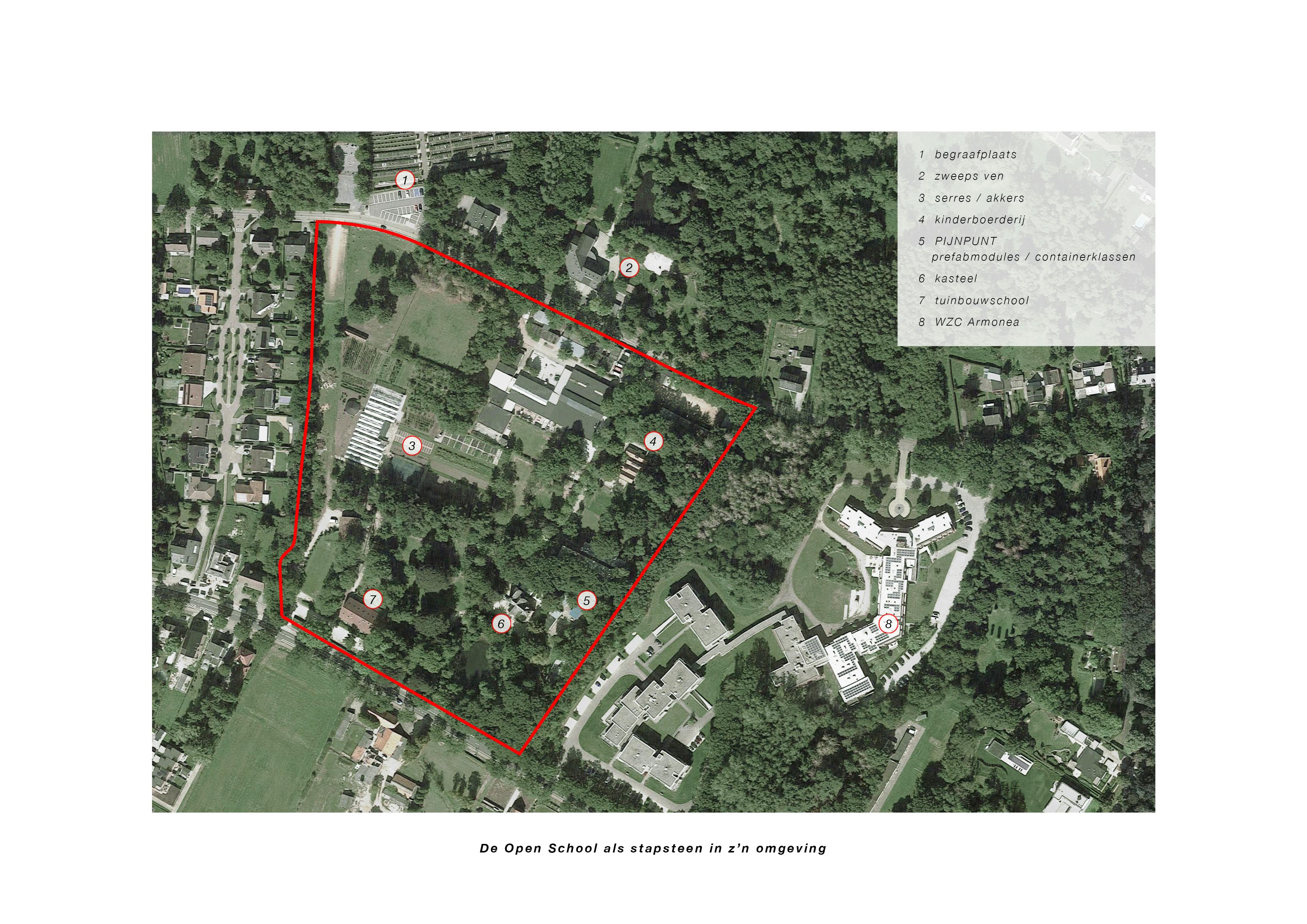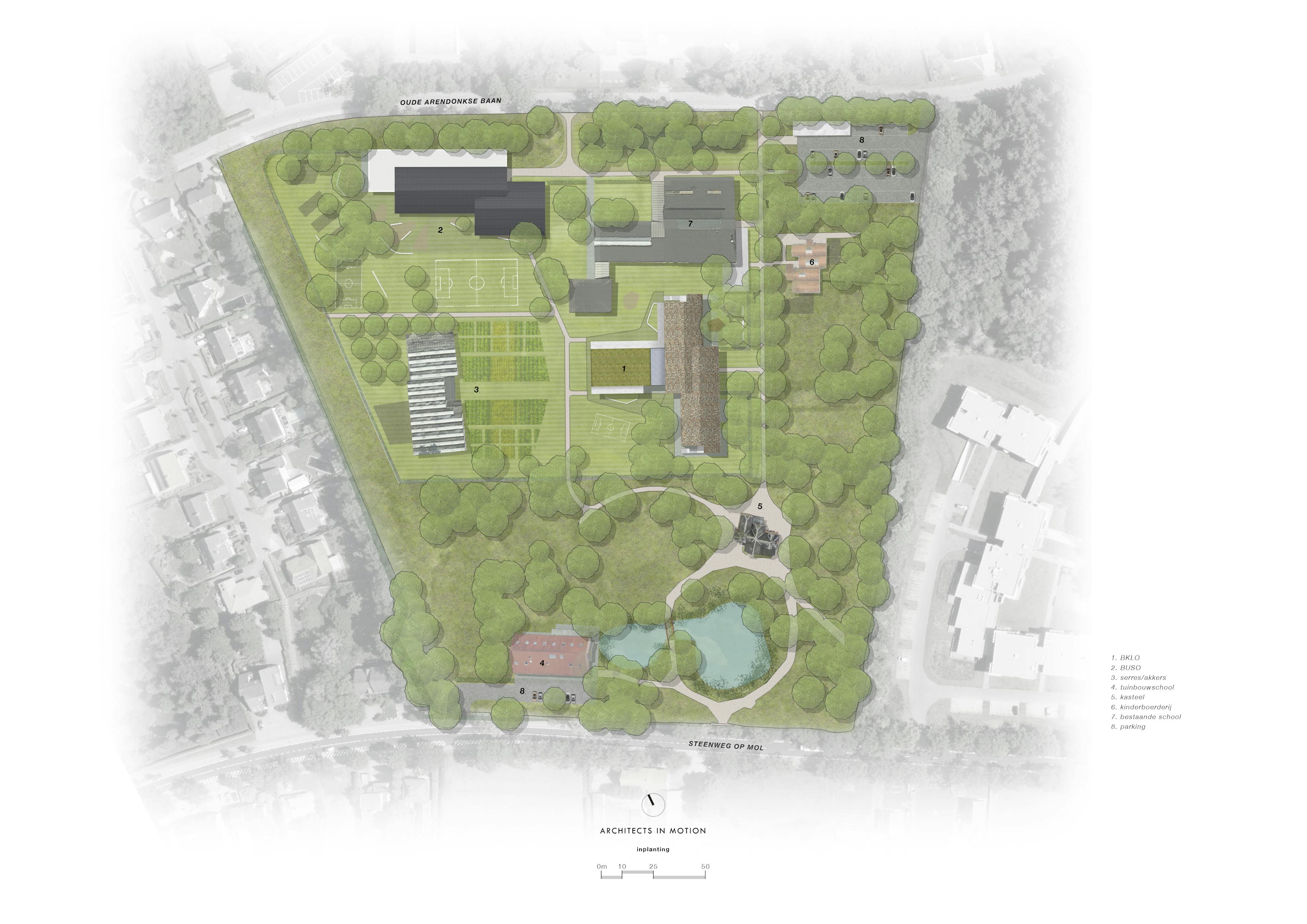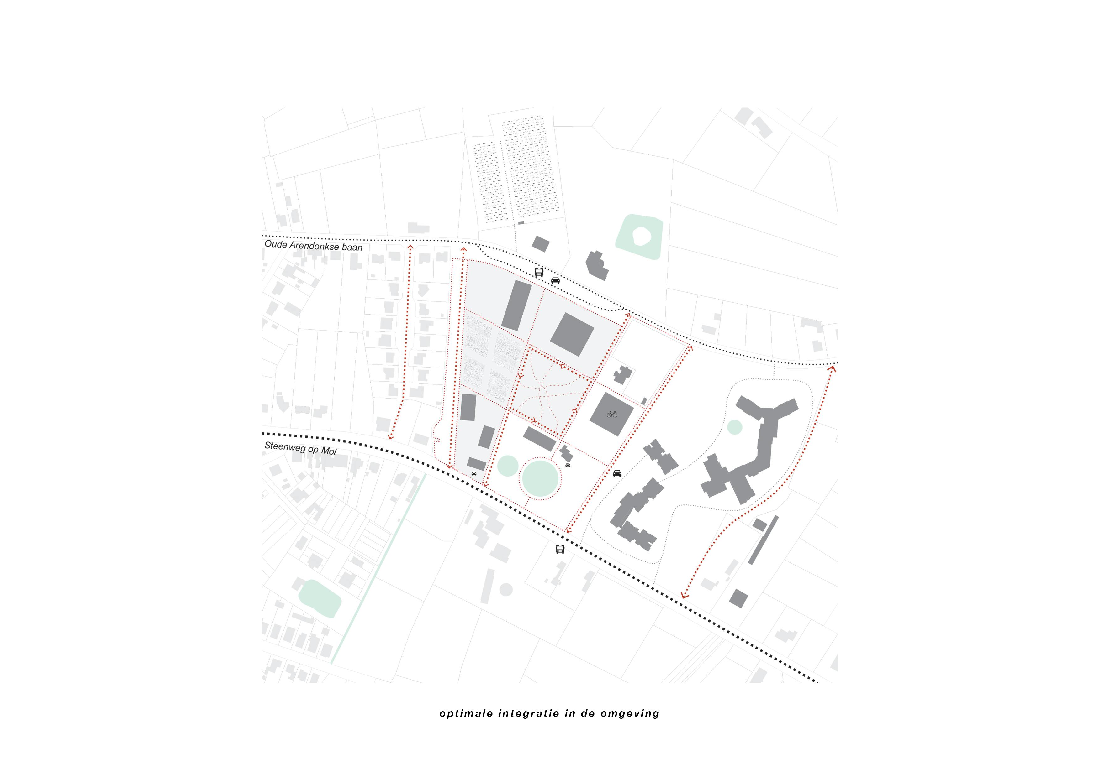 In de ruimere stedenbouwkundige context is er een opmerkelijke constante: groen. De site ligt tussen twee verkeersaders die de groene zone van oost naar west doorkruisen, namelijk de Steenweg op Mol en de Oude Arendonkse Baan. De nieuw ontworpen secundaire noord-zuidassen die de twee hoofdverkeersassen verbinden, structureren en ontsluiten de site. Aan de westzijde van de projectzone loopt een ondergrondse gasleiding. Deze bouwvrije zone wordt ingericht als bufferzone tussen de schoolsite en de naastliggende woonwijk. De bestaande groene buffer tussen de schoolsite en de aangrenzende serviceflats en het woonzorgcentrum wordt een groene fiets- en wandelweg. De site zelf is een aaneenschakeling van groene kamers met elk een eigen identiteit. Het nieuwe ontwerp versterkt de begrenzing van deze kamers en zorgt mede door een uitgekiende inplanting van de nieuwe gebouwen dat de doorwaadbaarheid van de site beter gedefinieerd wordt. Grote delen van de site worden publiekelijk toegankelijk, de schoolzones worden daar waar het noodzakelijk is, omheind. De opdeling in bestaande en/of nieuwe entiteiten zorgt ervoor dat de gebouwen elk apart kunnen functioneren en een relatie kunnen aangaan met de omgeving of andere entiteiten. Elke entiteit heeft een toegang die secundair is aan de hoofdtoegang. De kinderboerderij kan bijvoorbeeld een meerwaarde vormen voor de bewoners van de serviceflats en het woonzorgcentrum. Anderzijds kunnen de leerlingen die tuinbouw studeren als pedagogisch project ingezet worden om de tuin van deze senioreninfrastructuur te onderhouden.