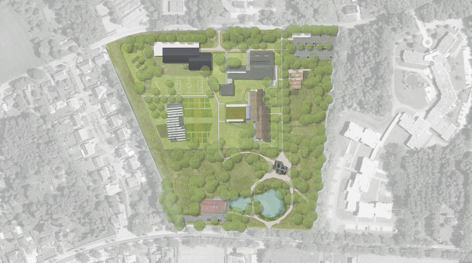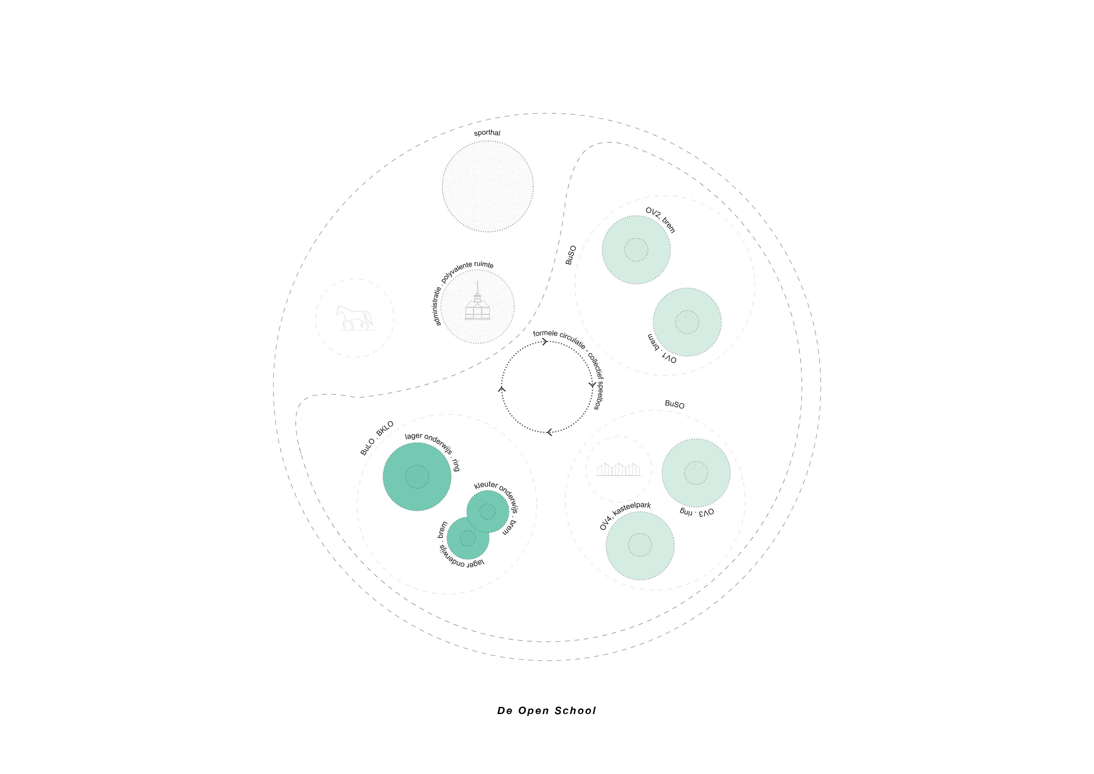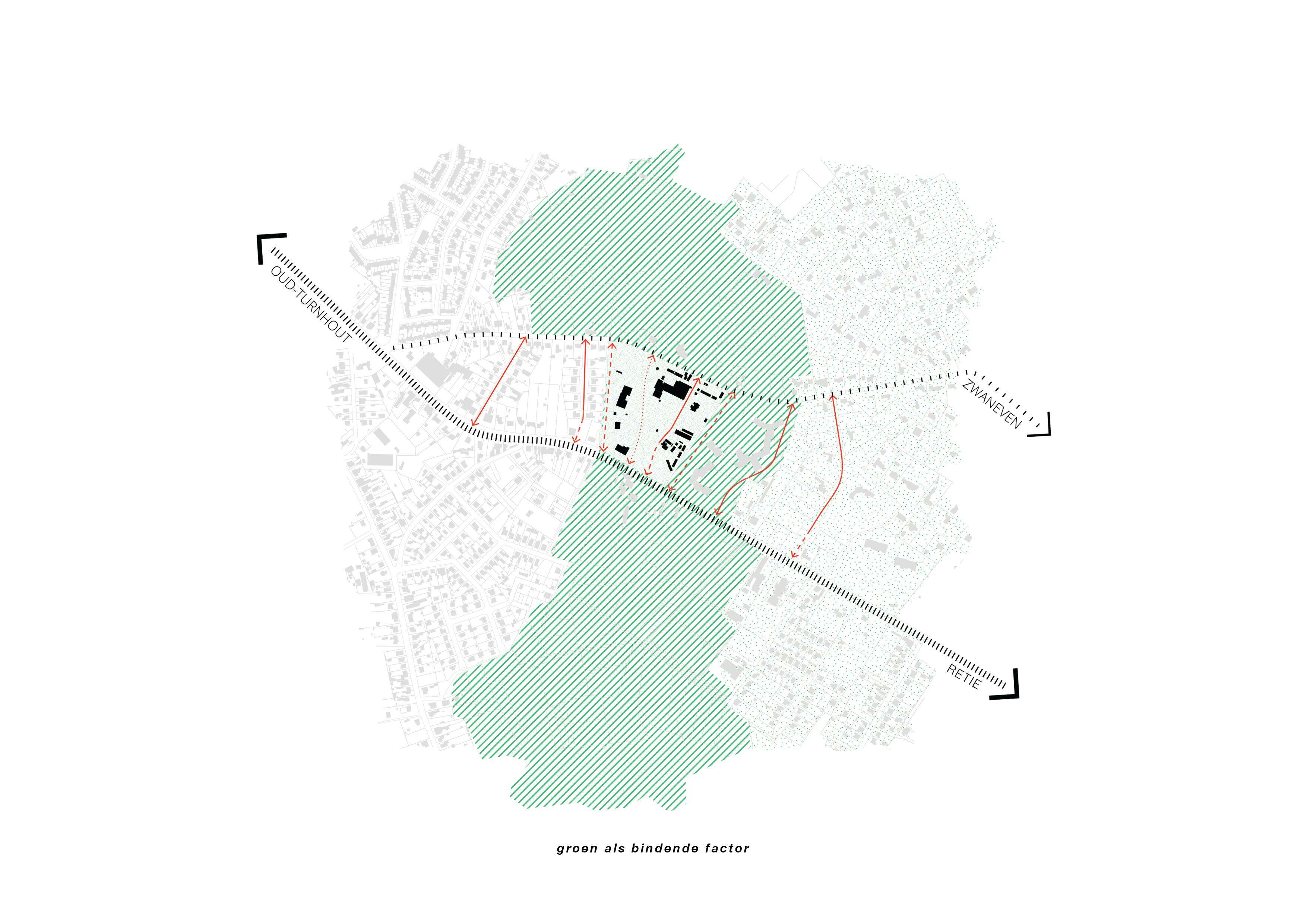 In de ruimere stedenbouwkundige context is er een opmerkelijke constante: groen. De site ligt tussen twee verkeersaders die de groene zone van oost naar west doorkruisen, namelijk de Steenweg op Mol en de Oude Arendonkse Baan. De nieuw ontworpen secundaire noord-zuidassen die de twee hoofdverkeersassen verbinden, structureren en ontsluiten de site. Aan de westzijde van de projectzone loopt een ondergrondse gasleiding. Deze bouwvrije zone wordt ingericht als bufferzone tussen de schoolsite en de naastliggende woonwijk. De bestaande groene buffer tussen de schoolsite en de aangrenzende serviceflats en het woonzorgcentrum wordt een groene fiets- en wandelweg. De site zelf is een aaneenschakeling van groene kamers met elk een eigen identiteit. Het nieuwe ontwerp versterkt de begrenzing van deze kamers en zorgt mede door een uitgekiende inplanting van de nieuwe gebouwen dat de doorwaadbaarheid van de site beter gedefinieerd wordt. Grote delen van de site worden publiekelijk toegankelijk, de schoolzones worden daar waar het noodzakelijk is, omheind. De opdeling in bestaande en/of nieuwe entiteiten zorgt ervoor dat de gebouwen elk apart kunnen functioneren en een relatie kunnen aangaan met de omgeving of andere entiteiten. Elke entiteit heeft een toegang die secundair is aan de hoofdtoegang. De kinderboerderij kan bijvoorbeeld een meerwaarde vormen voor de bewoners van de serviceflats en het woonzorgcentrum. Anderzijds kunnen de leerlingen die tuinbouw studeren als pedagogisch project ingezet worden om de tuin van deze senioreninfrastructuur te onderhouden.