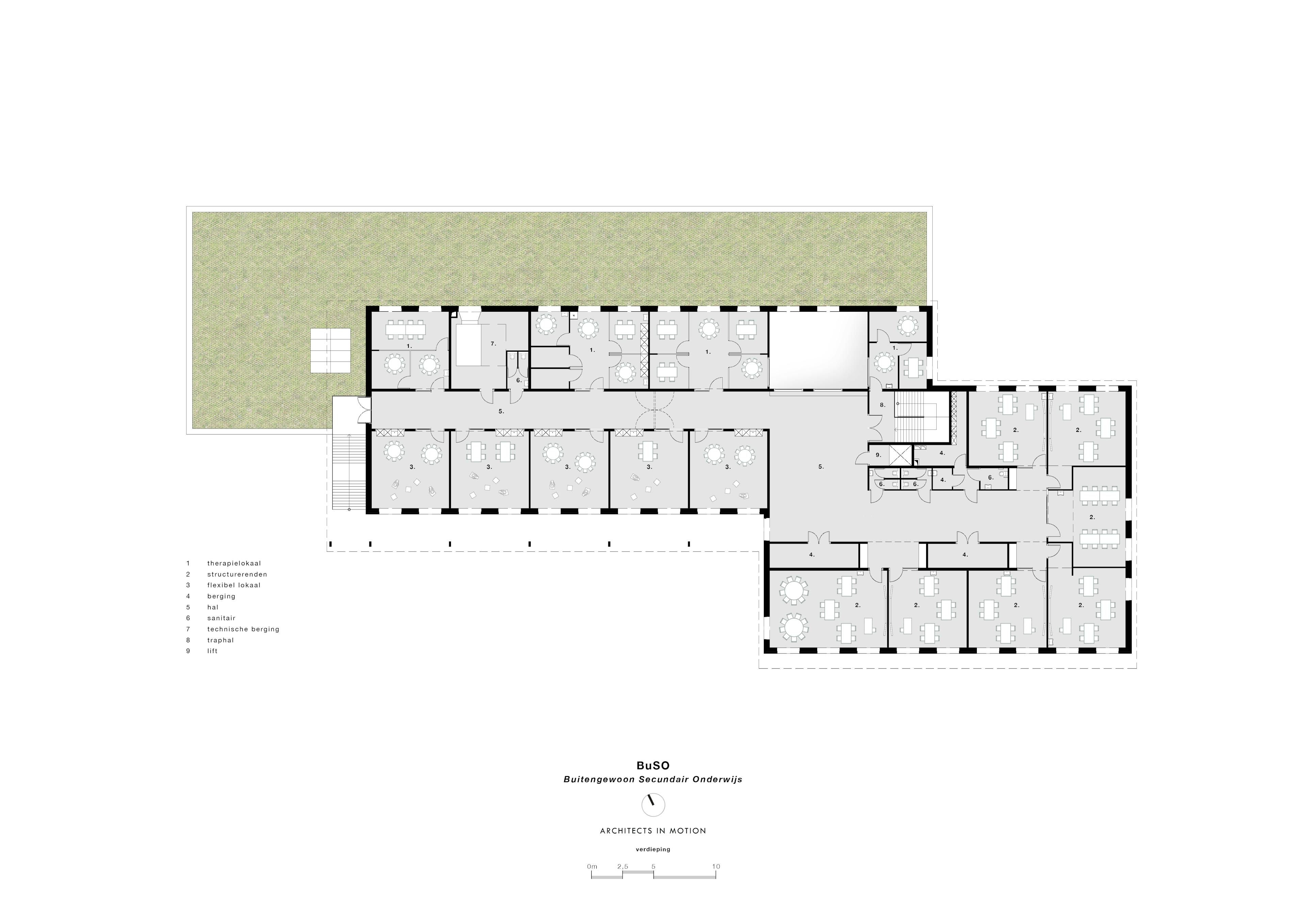 Als je de lift of trap neemt naar de eerste verdieping kom je in een ruime, lichte gangzone met een grote vide naar het gelijkvloers. Boven de zone van de refter bevinden zich lokalen voor structurerende taken en begeleiding, één van de vier verwerkingsniveaus van het buitengewoon secundair onderwijs. In de andere vleugel van de verdieping vinden we vooral therapie- en flexibele lokalen. De technische ruimte is centraal in het gebouw ingeplant om de leidingentracés te optimaliseren.