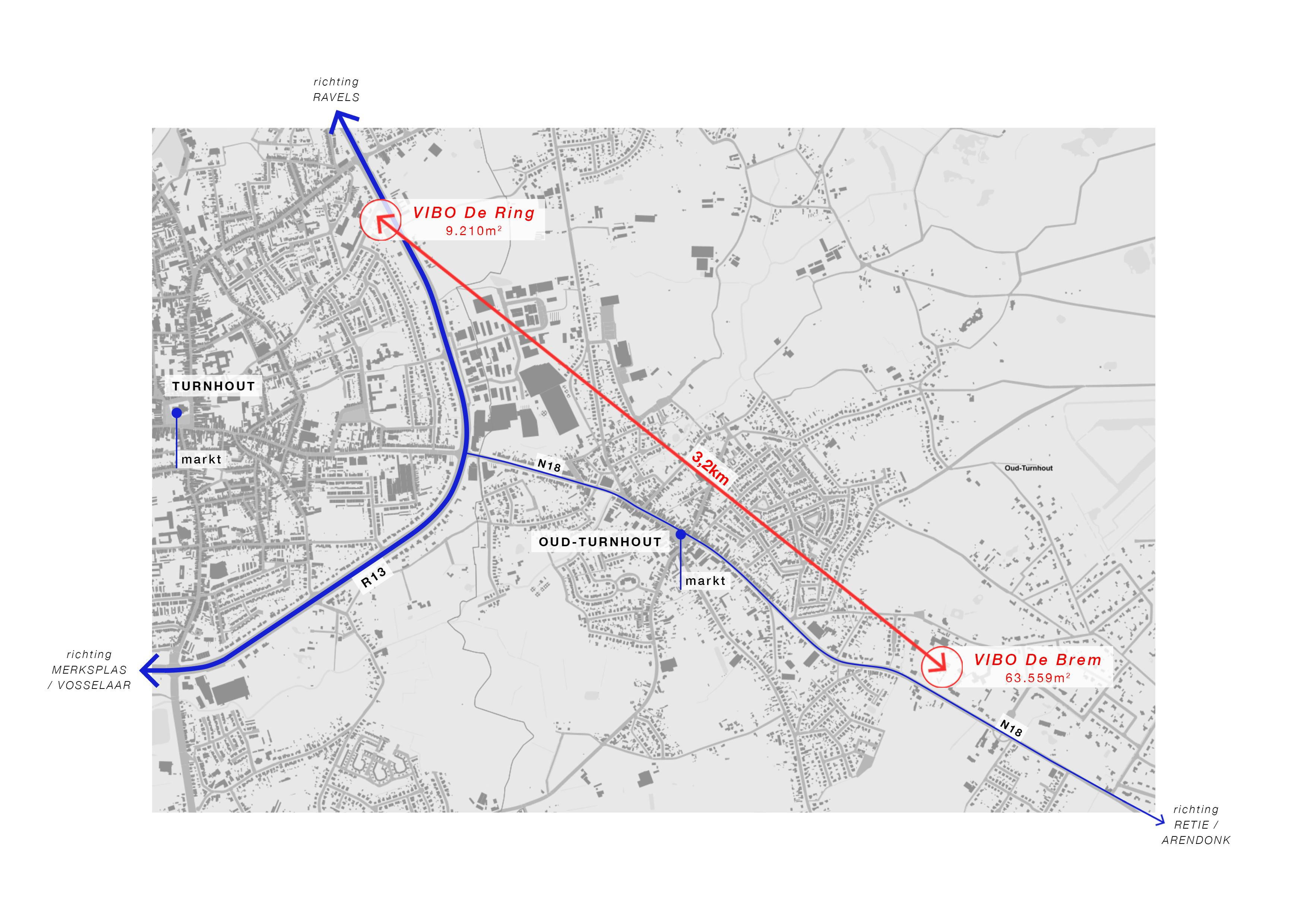 Deze gestage groei manifesteerde zich ook in een constante nood aan uitbreiding van de huisvesting. Momenteel liggen de gebouwen verspreid over twee locaties: VIBO De Brem aan de Oude Arendonkse Baan in Oud-Turnhout en VIBO De Ring aan de Noord-Brabantlaan in Turnhout, een onderdeel van de R13, de ring rond Turnhout. Op haar beurt dreigde deze beschikbare bebouwde oppervlakte te klein te worden en omdat er geen budget was om bij te bouwen, werden door een sponsor tijdelijk 130 containers ter beschikking gesteld waarin klaslokalen konden worden ondergebracht. Toen er enkele jaren geleden zicht kwam op een eventuele derde locatie, een leegstaande school in Ravels, werd architect Luc Vanhout van Architects in Motion (AIM) gevraagd een kostenraming te maken om de aanpassingswerken te begroten.