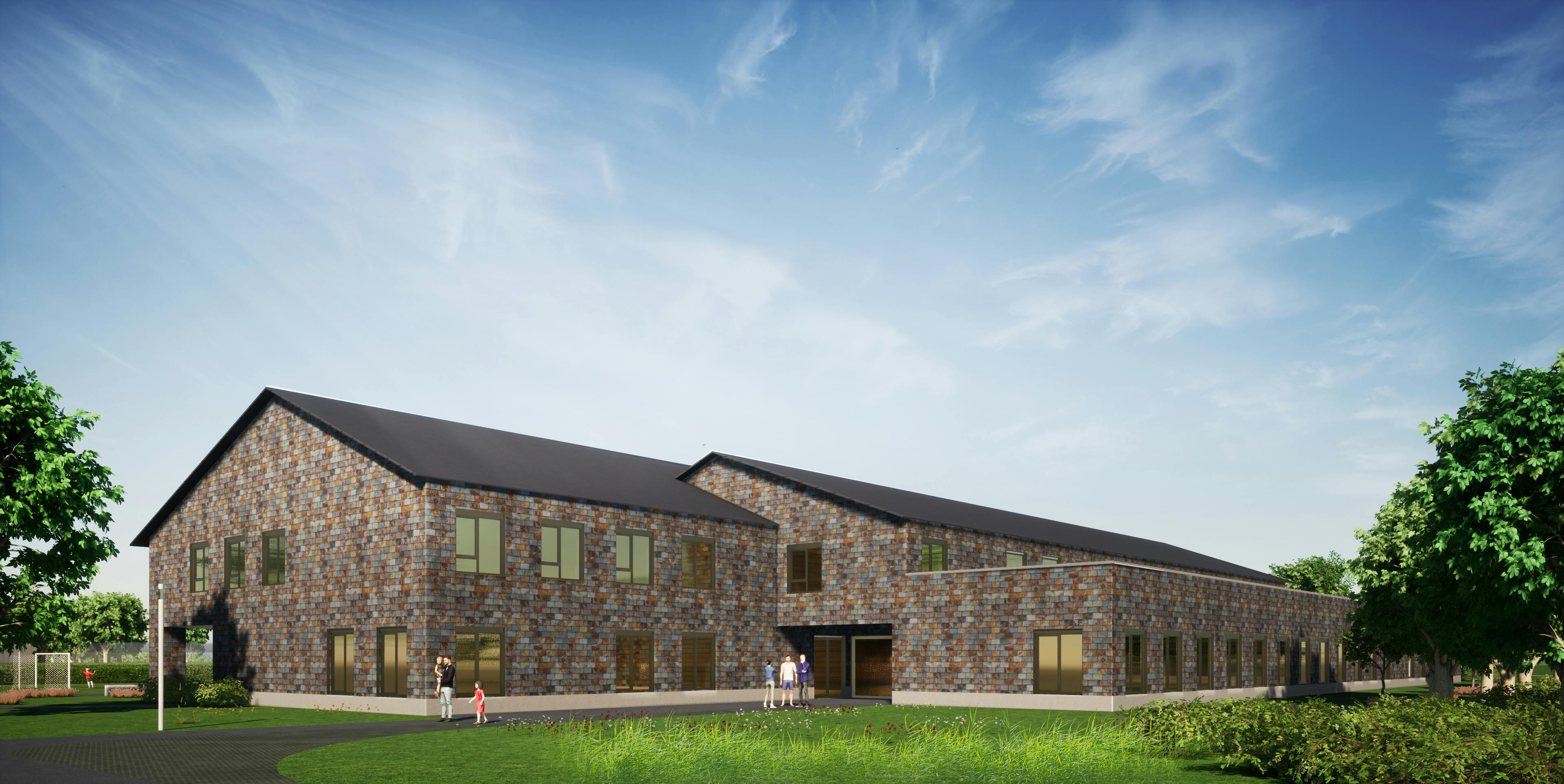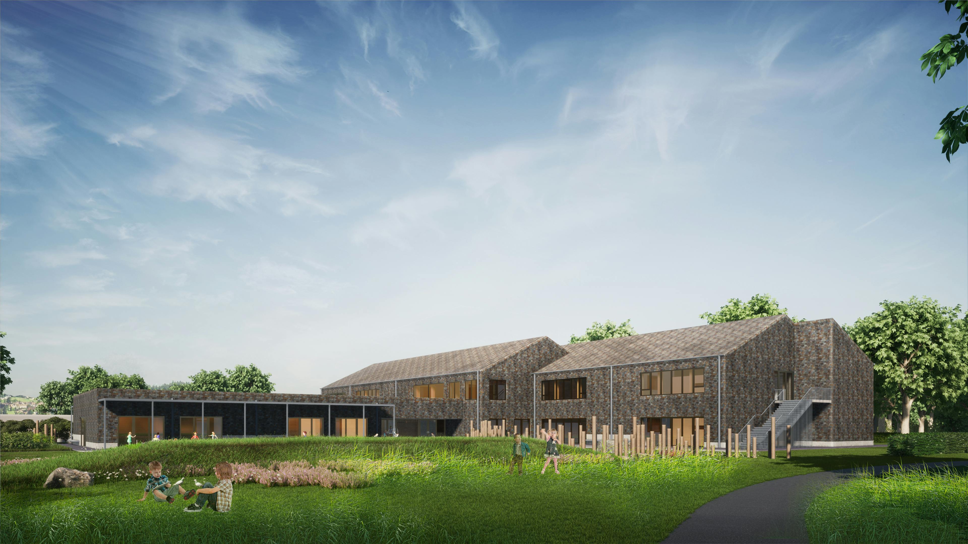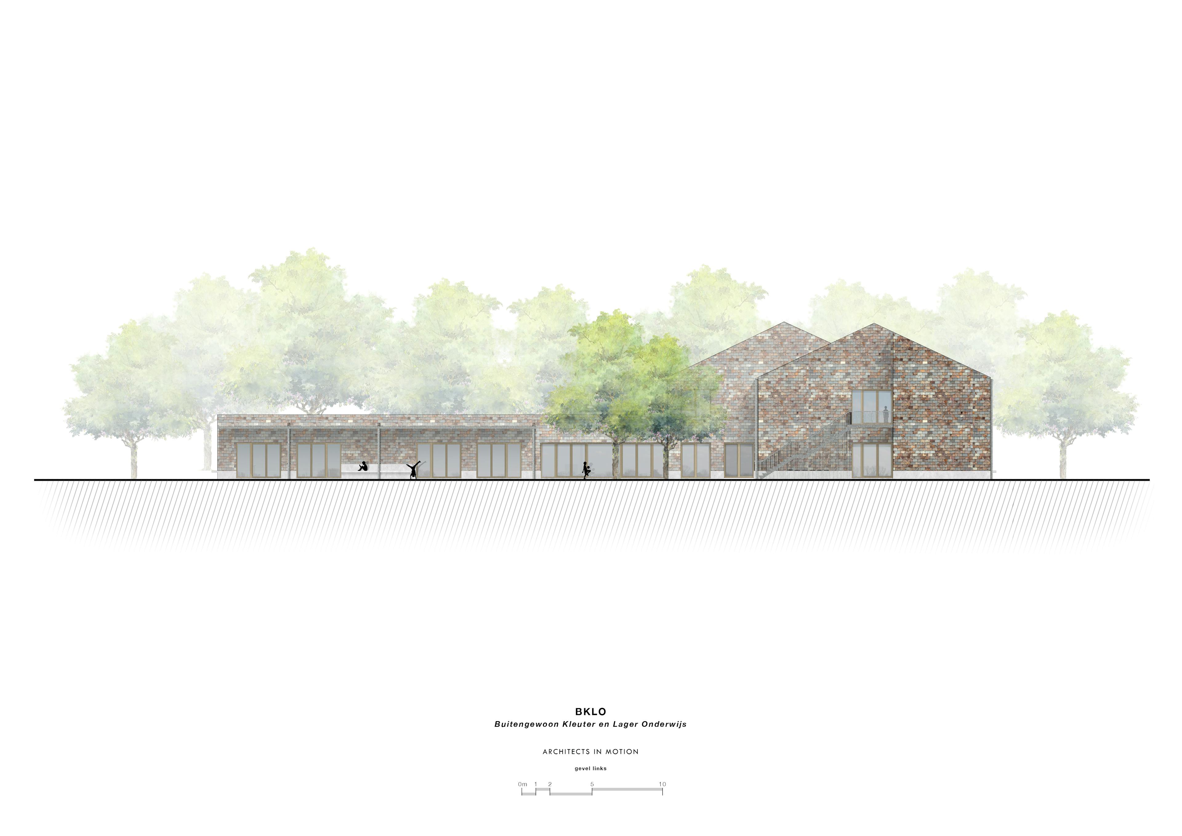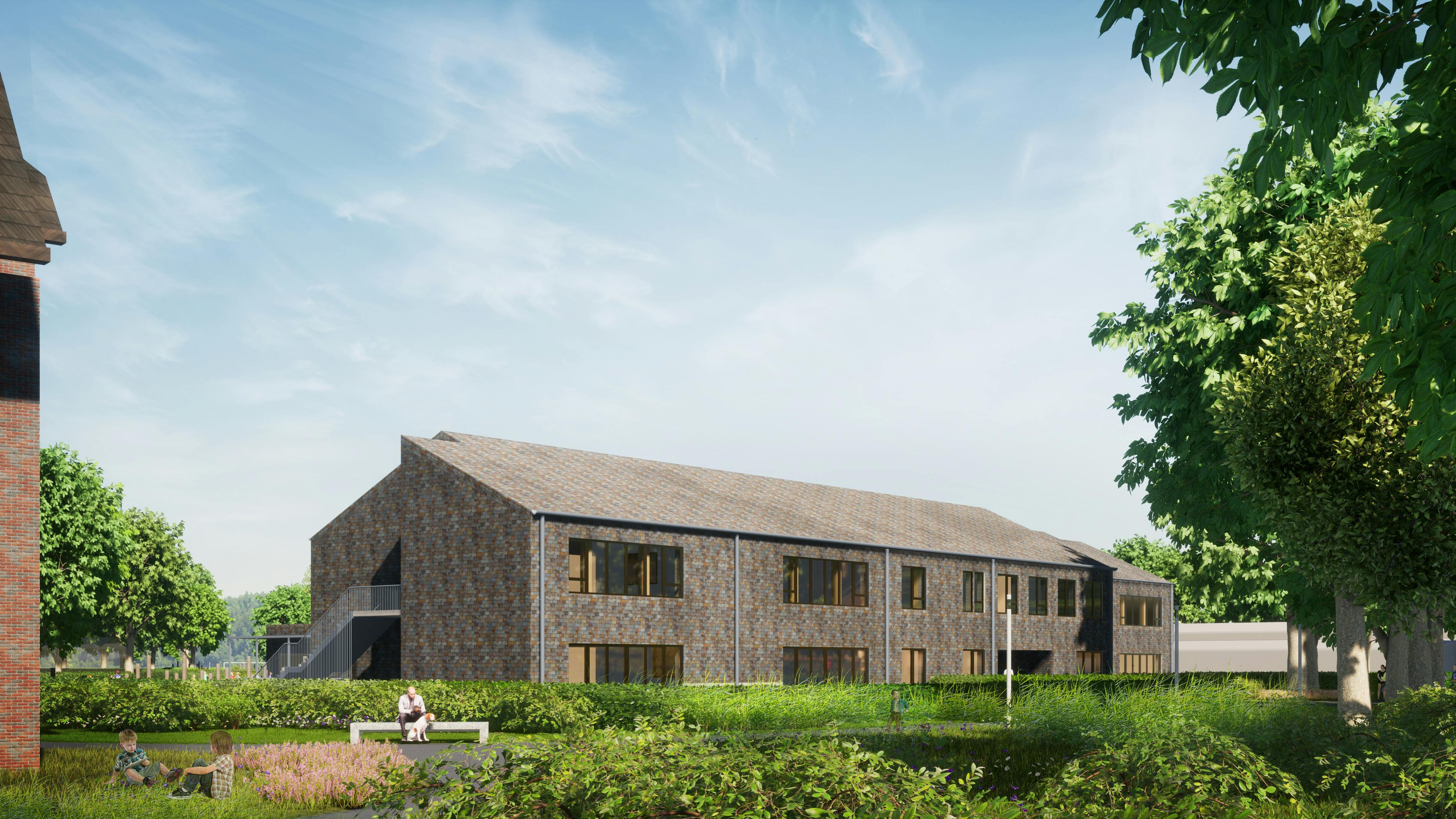 Voor de volumetrische uitwerking van de gebouwen lieten de architecten zich inspireren door de typologie van de Kempische langgevelschuur. Om de typische en karakteristieke esthetische dominantie van het schuine dak met grote dakvlakken te accentueren worden de daken en de gevel van de eerste verdieping in hetzelfde materiaal uitgevoerd. Het volume van de langgevelschuur wordt schijnbaar opgetild, wat de impact van de volumes op de omgeving drastisch verkleint. De sokkel wordt uitgevoerd in architectonisch beton. De grote raampartijen en de doordachte inplanting ervan zorgen voor doorkijkassen die samen met de uitsnijdingen uit de volumes en het verspringend ritme van de dakvlakken de gebouwen een transparante luchtigheid geven en de grens tussen natuur en gebouw quasi volatiel ervaren wordt. Omgeving uit Antwerpen tekent voor het groenontwerp. Hun inspiratiebron is het typisch Kempische landschap met bossen, vennen en begroeide zandheuveltjes. De secundaire toegangswegen slingeren tussen de bomen, de bestaande vijver en de gebouwen alsof het bospaden zijn die voor de wandelaar achter elke bocht een andere visuele beleving in petto hebben. De pedagogische tuin en de kinderboerderij worden naadloos in het geheel geïntegreerd.