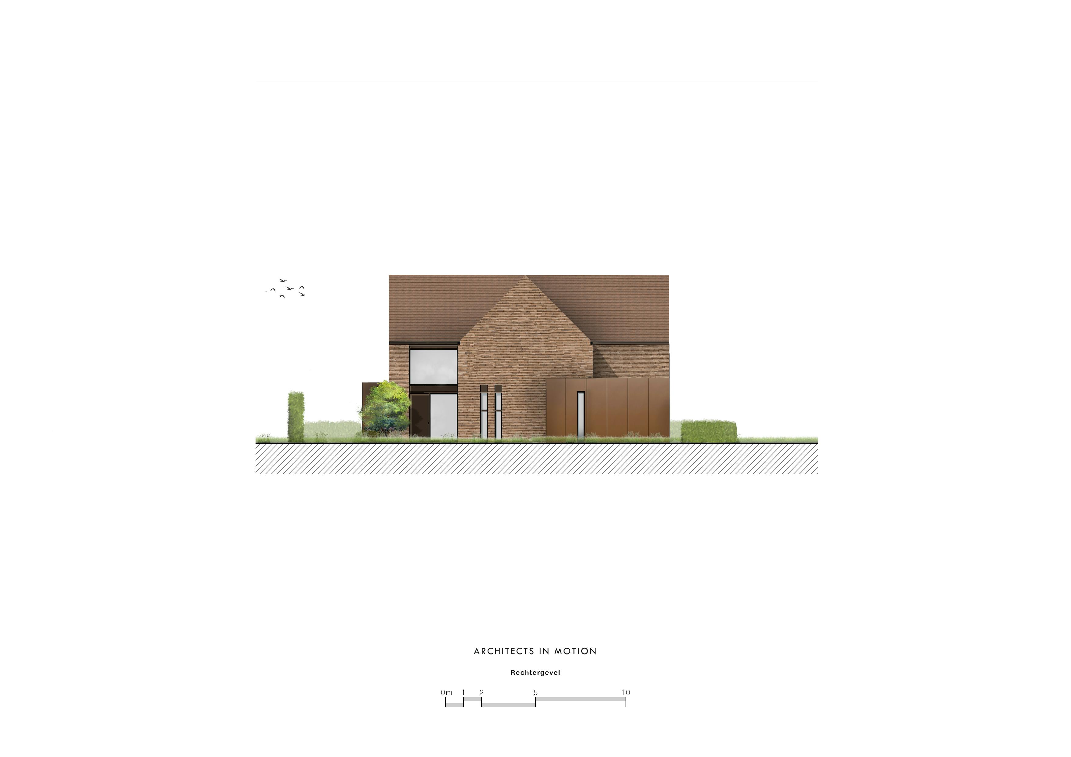 Om de geslotenheid van de voorgevel niet te doorbreken, werd de inkom van de woning ‘achter het hoekje’ geplaatst, met zicht op en bereikbaar via de voortuinstrook. Deze voortuinstrook wordt met een leibomenhaag van de openbare weg afgeschermd en er ontstaat een duidelijk gedefinieerde tuinkamer. Het raam- en deurgeheel van de inkomhal is twee verdiepingen hoog en zorgt voor licht maar tegelijkertijd voor privacy in het ‘daggedeelte’ van de nachthal. Ook van hieruit heb je een interessant zicht op de voortuinstrook en krijg je een perspectief op de zijtuinstrook en een suggestie van de grootsheid van het perceel en de planmatige transparantie van het geheel.