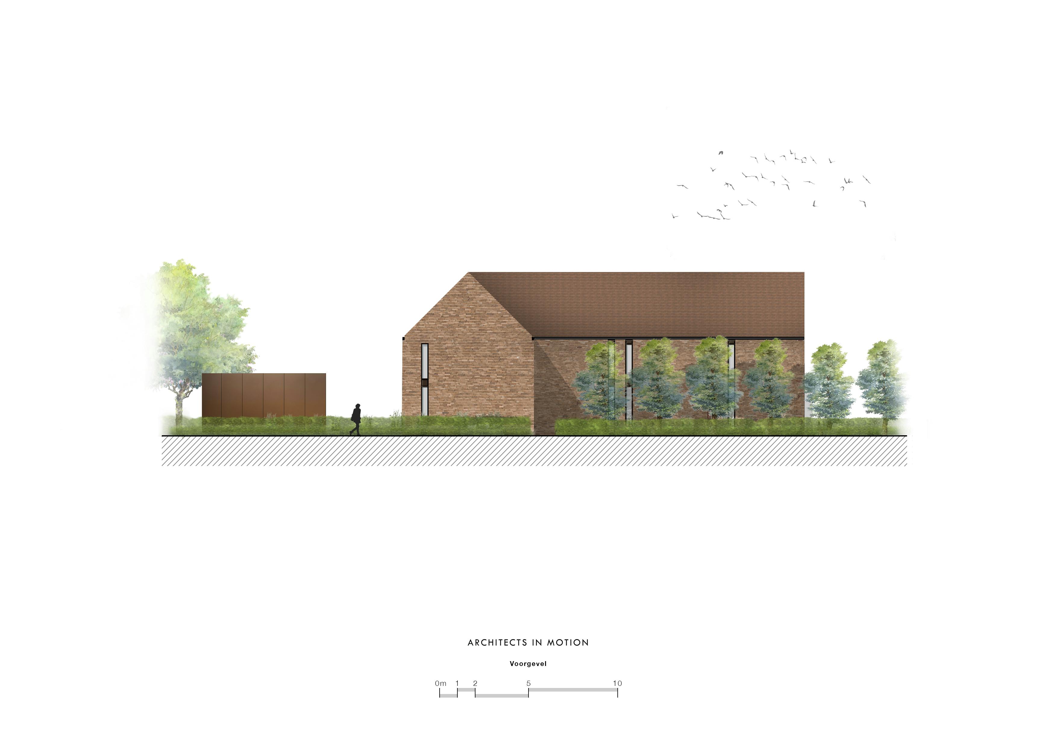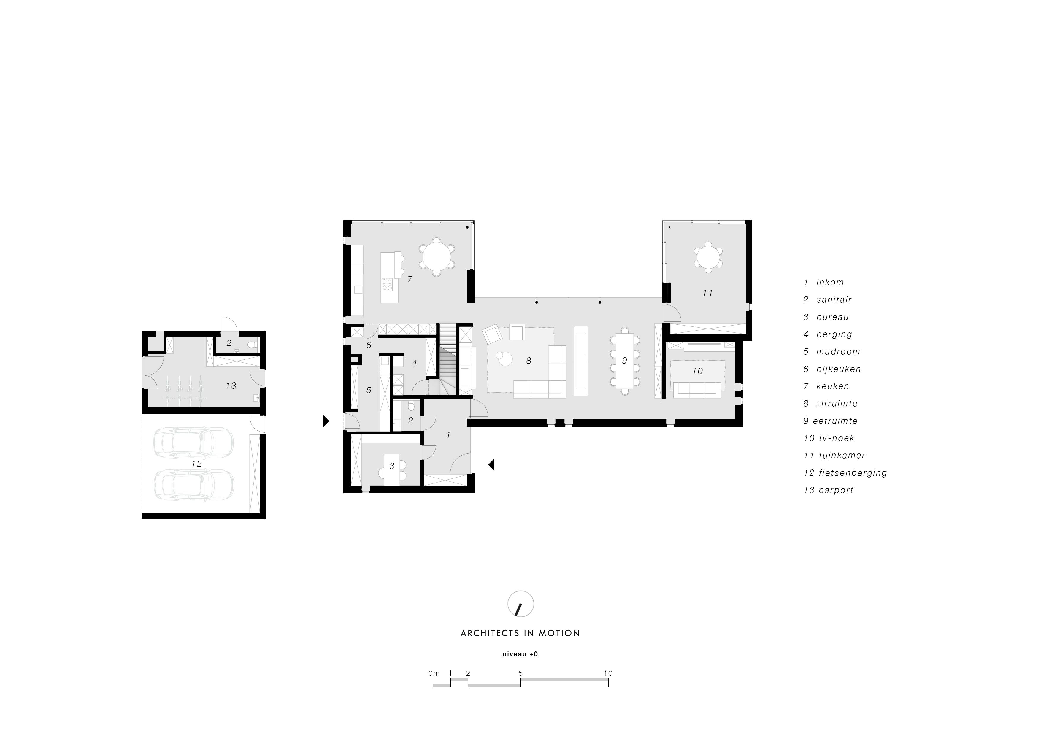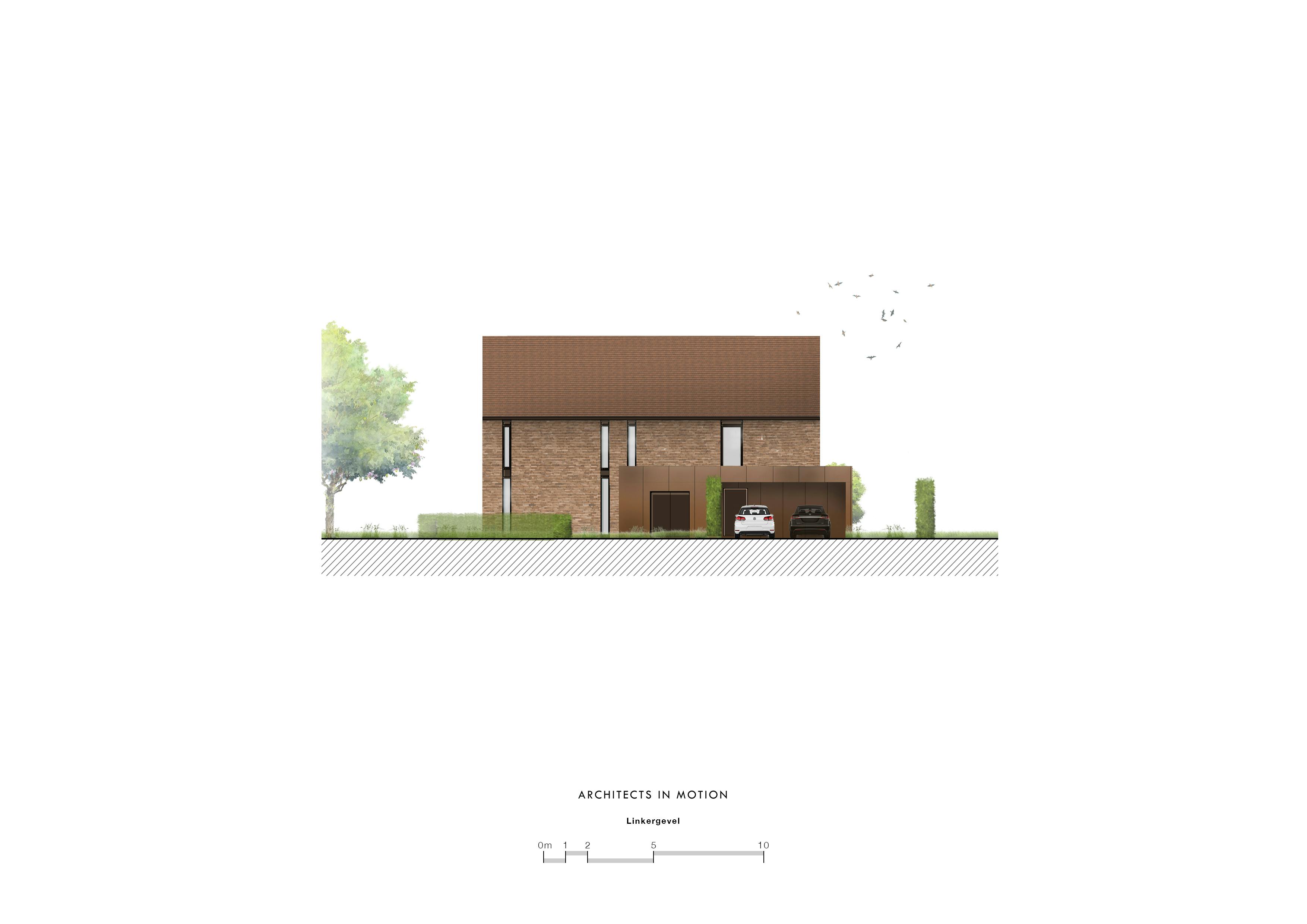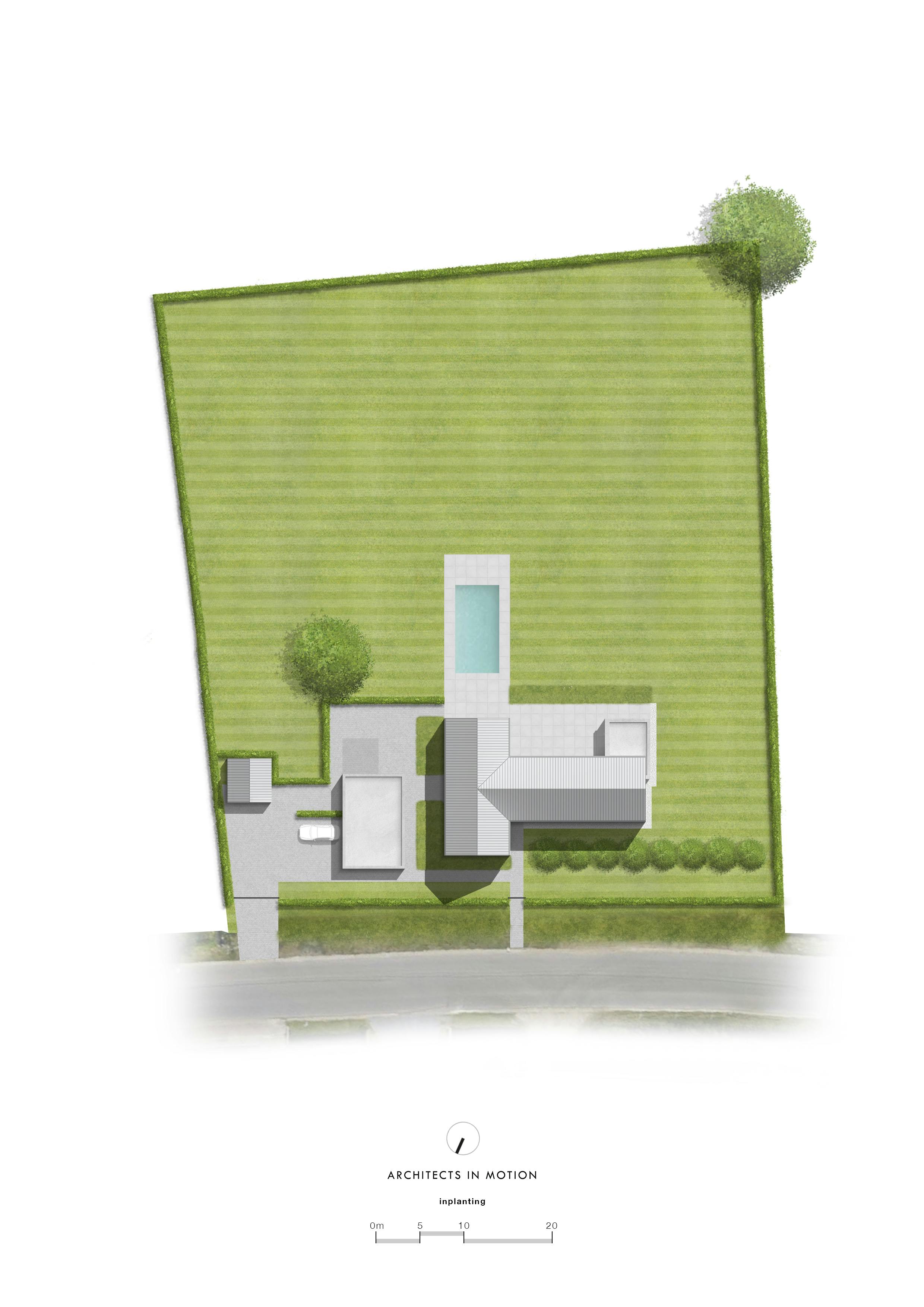 In het verlengde van het uitspringende keukenvolume werd het zwembad ontworpen dat ongeveer op het midden van het perceel ligt. De inplanting van het zwembad in de lengterichting, versterkt de zichtlijnen en het perspectief vanuit de leefkeuken. Door de woning asymmetrisch op het bouwterrein in te planten, ontstaat er aan de linkerzijde van de woning extra ruimte om een aparte oprit met dubbele carport te voorzien, waarvan de toegang aan het straatzicht onttrokken is. Achter de carport, aan de tuinzijde, bevindt zich een fietsen- en tuinberging en extra toilet. Een leuk idee is dat er via de zone tussen de woning en de carport, in het verlengde van de deur die toegang biedt tot de carport, een dienstingang is waardoor je via de ‘mudroom’ – een ruimte waar natte kleding en schoeisel kan uitgetrokken worden – en de bijkeuken/berging, de ‘eigenlijke’ woning betreedt. Het volume van de carport is bewust laag gehouden. De bedoeling is dat het volume op termijn ‘onder of in het groen zal verdwijnen’.