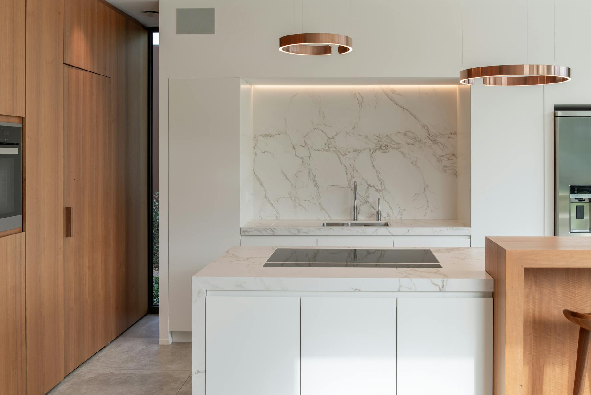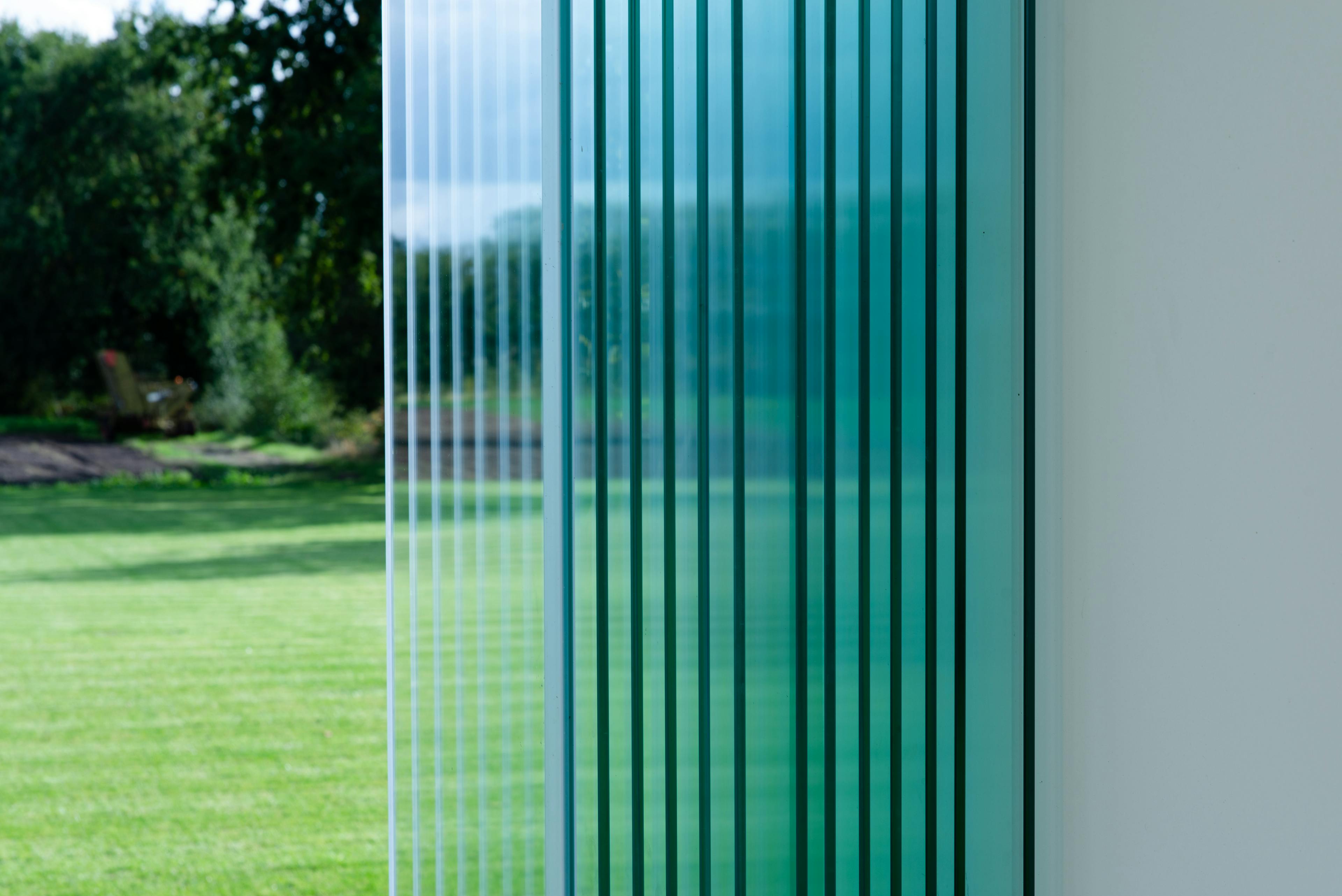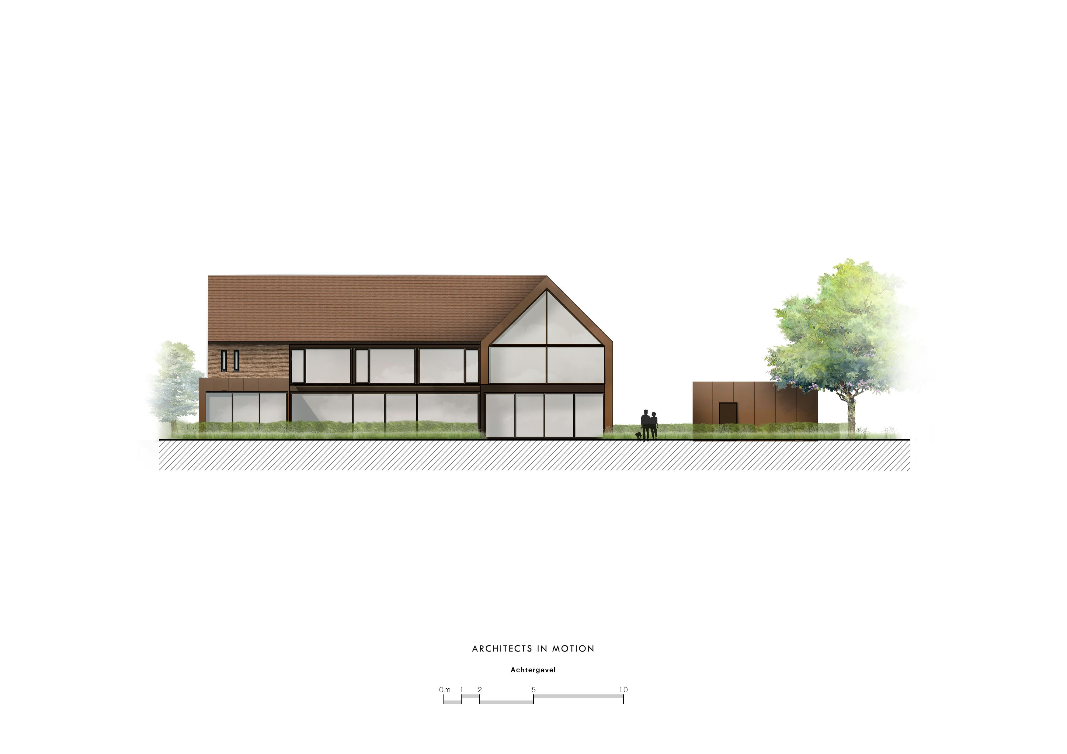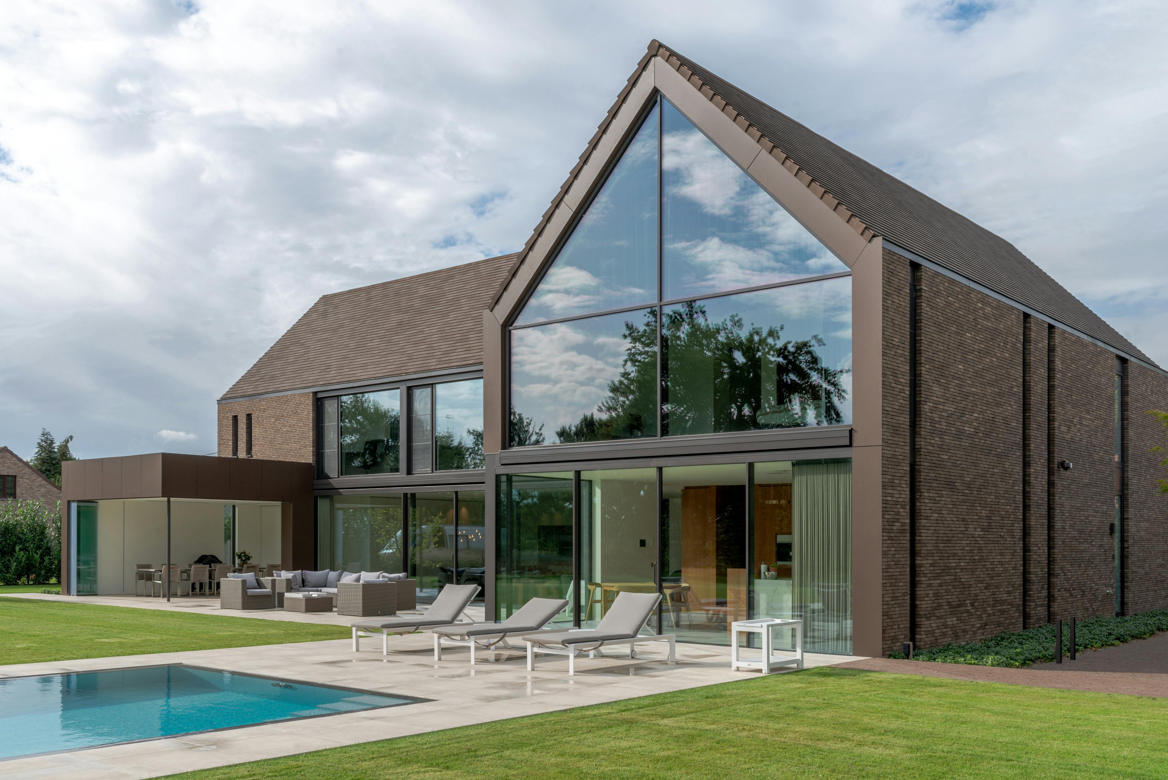 In de zit- en eethoek ervaar je de ‘scenische’ architectuur van deze woning optimaal: via plafondhoge schuiframen voel je bijna geen afsluiting tussen ‘woning’ en ‘tuin’. Als gebouwd concentraat van dit idee, en als gematerialiseerde tegenpool van de groene tuinkamer in de voortuinstrook, ontwierp AIM achteraan de woning, als annex aan de woonruimte en het buitenterras, een tuinkamer die indien gewenst met glazen schuifpanelen volledig afgesloten kan worden. Met deze hybride ruimte voorkomt de architect dat er naast het zwembad een poolhouse ontworpen diende te worden die het zicht op de tuin en de natuur zou belemmeren. Het grote terras aan de woonkamer wordt enerzijds omsloten door deze tuinkamer, anderzijds door het volume van de leefkamer.