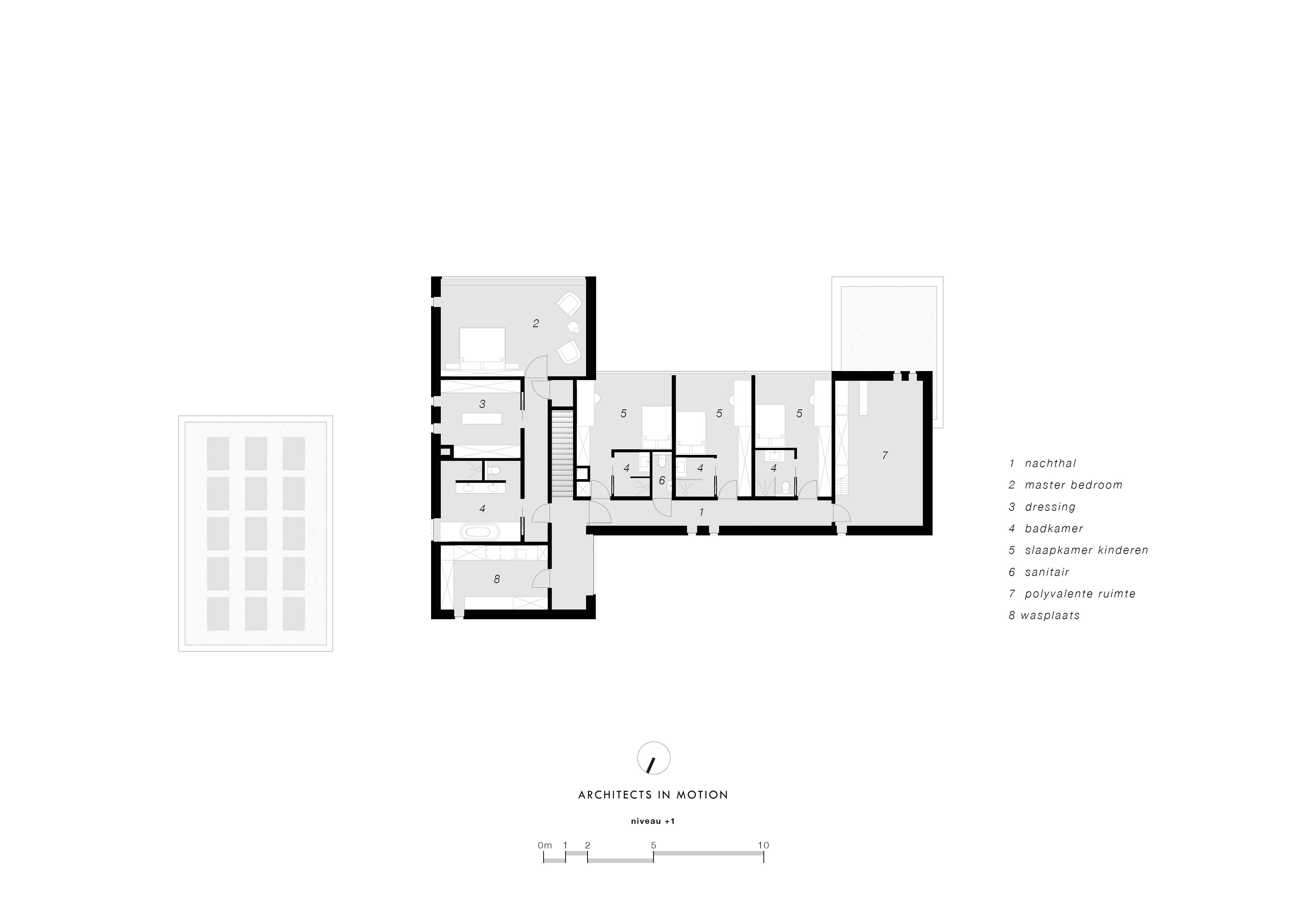 De driedimensionale werking van de twee gekruiste volumes voel je ook op de verdieping. Met de trap kom je in een afgesloten nachthal. In het lange, aan de straat evenwijdige volume, bevinden zich drie kinderkamers met elk een eigen douchekamer. De gang die van de nachthal is gescheiden met een deur eindigt aan de andere zijde in een polyvalente ruimte met een huisbar en een biljarttafel. Deze ruimte leent zich echter ook perfect als … feestruimte. Het is leuk ‘kind’ te zijn in dit huis!
