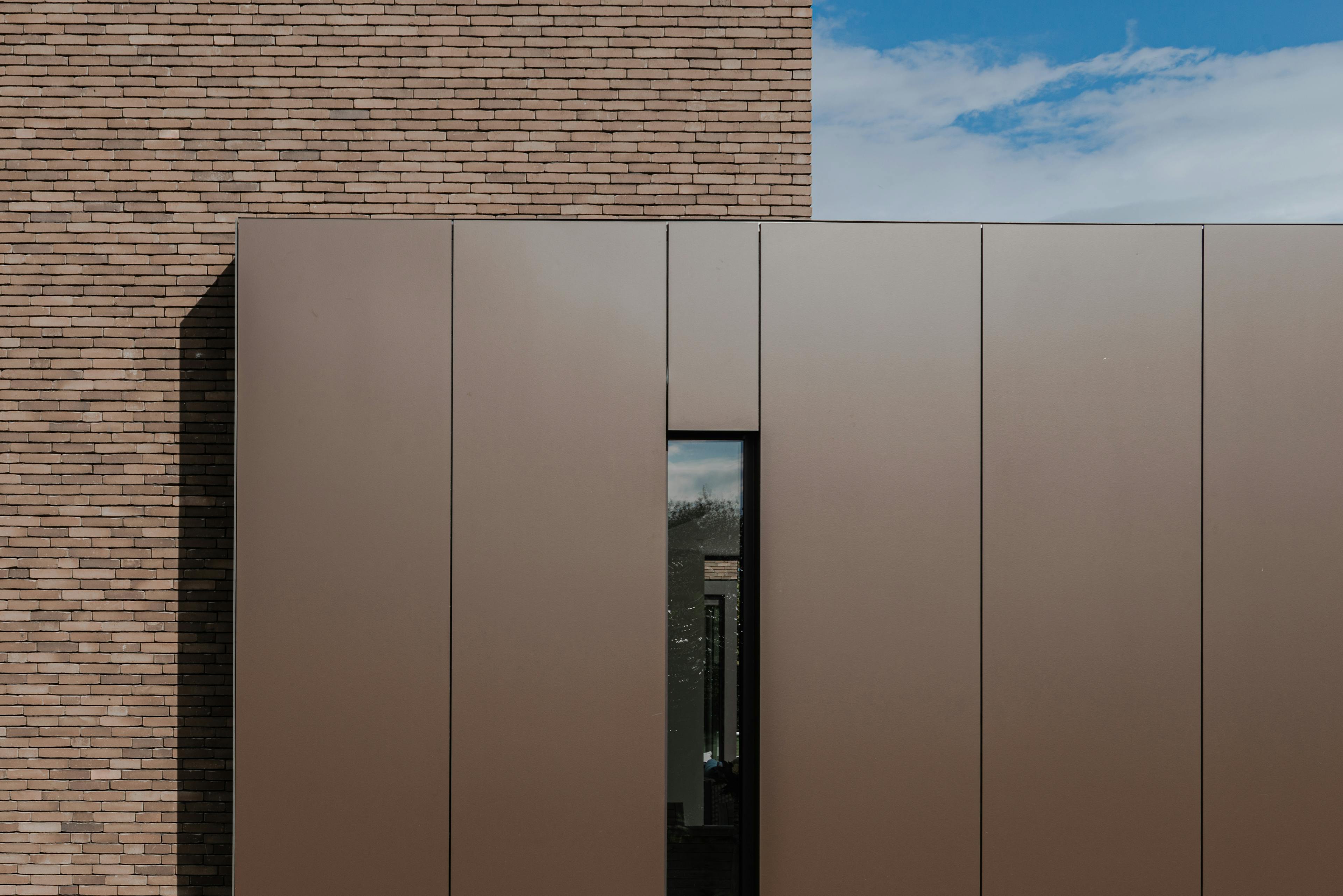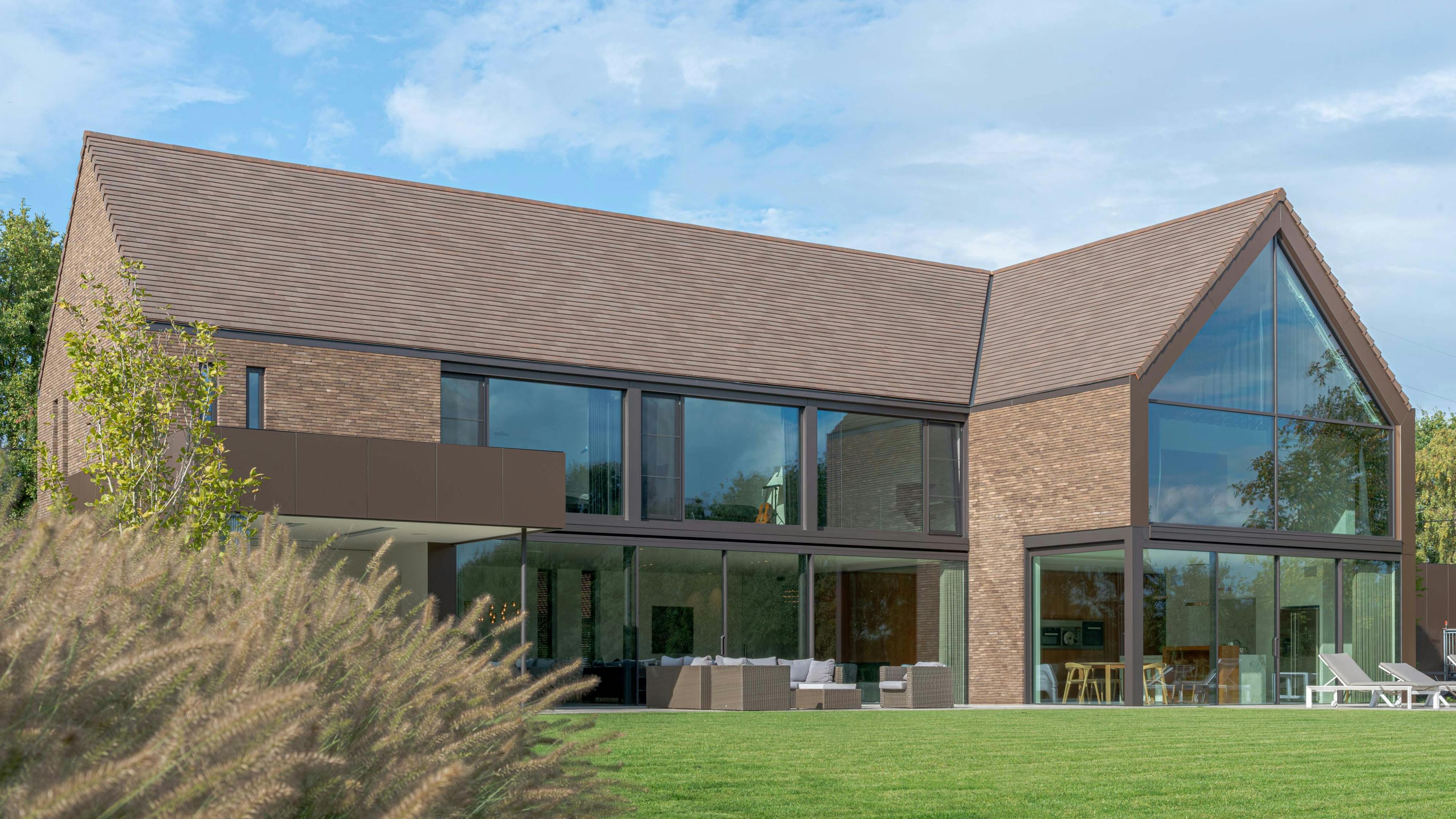 In woning DG - een ontwerp van Fréderic Wattecamps van Architects in Motion (AIM) - komen kenmerken van beide esthetische benaderingen wonderwel samen. De woning is ontworpen in twee krachtige volumes die elkaar ‘kruisen’. De voorzijde heeft een gesloten karakter terwijl de achtergevel de connectie met de tuin actief opzoekt. Grote overspanningen en een over twee verdiepingen opengewerkt volume maken dit contact mogelijk. Je zou kunnen stellen dat dit type huizen schatplichtig zijn aan Le Corbusier en zijn visionaire ideeën. Wat ook meteen opvalt is dat de architect bruin koos als hoofdtint. Ook in het interieur – waar houten accenten in alle ruimtes terugkomen – is bruin de ‘fil rouge’. In de ontbijtruimte annex open keuken bijvoorbeeld zijn de tafel, de stoelen en de barkrukken een letterlijke verwijzing naar de Quaker meubelontwerpen.