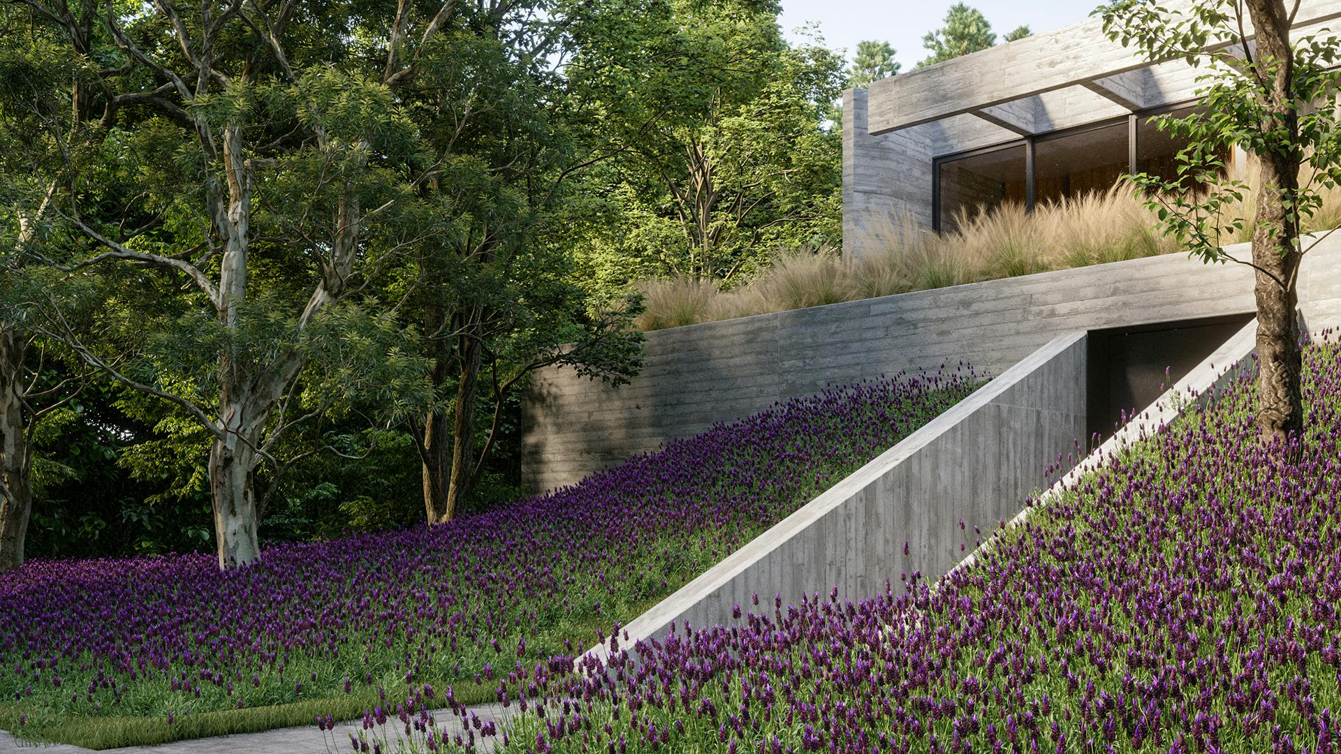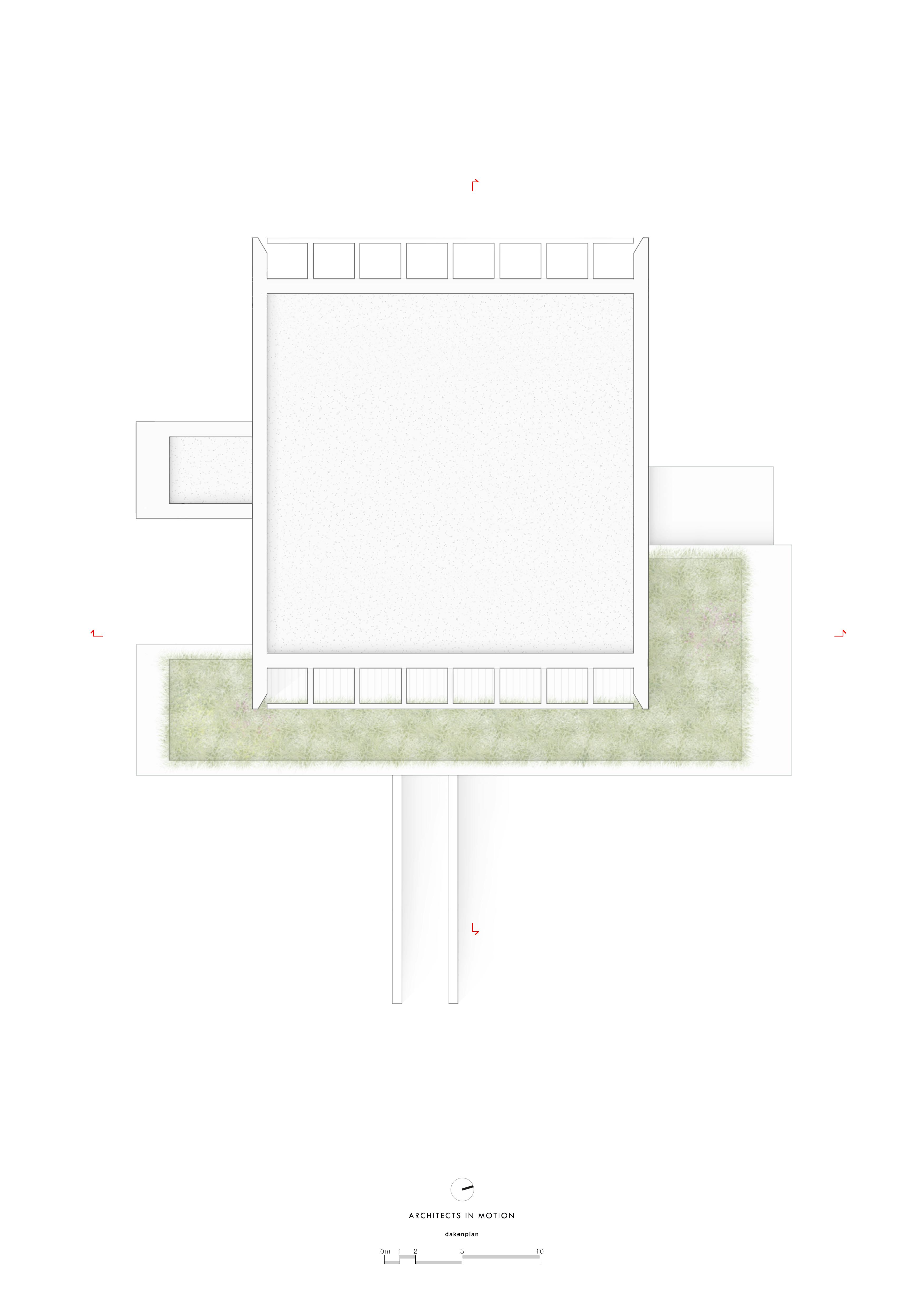 Als je rond de woning wandelt, krijg je pas echt een beeld van de grootte van de woning hoewel deze in geen enkel ontwerpaspect buiten proportie is. Debet hieraan zijn zeker de logische opeenvolging van open- en geslotenheid, het gebruik van ter plaatse gestort gewapend beton met nerfstructuur - dat de hardheid van het materiaal meteen countert door de zachtheid van de textuur - de volumes van de traphal en het bureau en niet in het minst de kunstmatige duin aan de voorgevel. Het volume van de verdieping wordt in een quasi perfect vierkant ingeschreven, terwijl het gelijkvloers aan de voorzijde van de woning groter is. Het dak op dat lagere volume wordt voorzien van een groendak zodat de heuvel er quasi naadloos mee aansluit. De privacy van het terras op de eerste verdieping wordt gegarandeerd door een aanplanting van pennisetum op de rand van het platte dak. Een zoveelste detail dat de ontwerpfilosofie van deze bijzondere woning onderstreept.