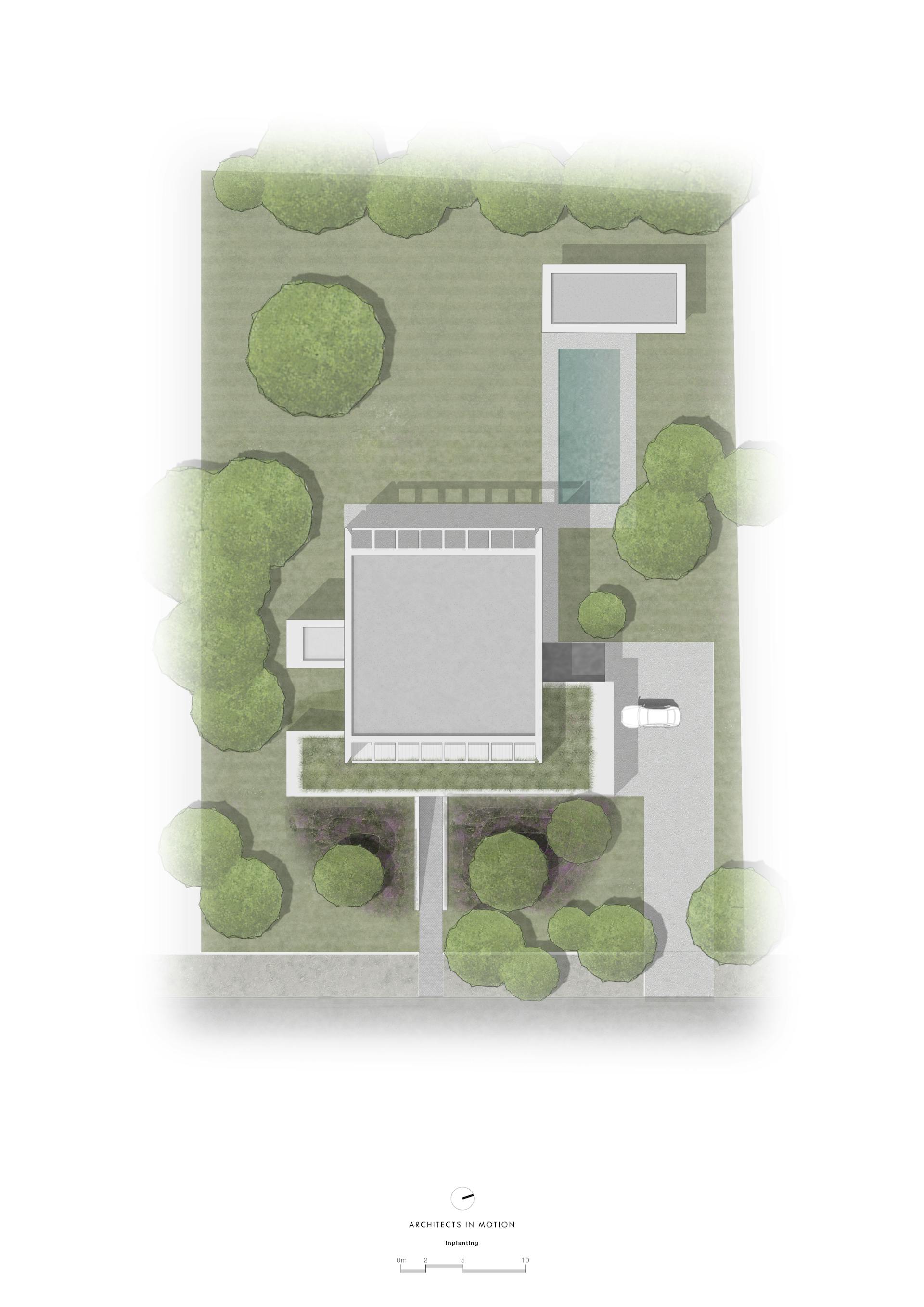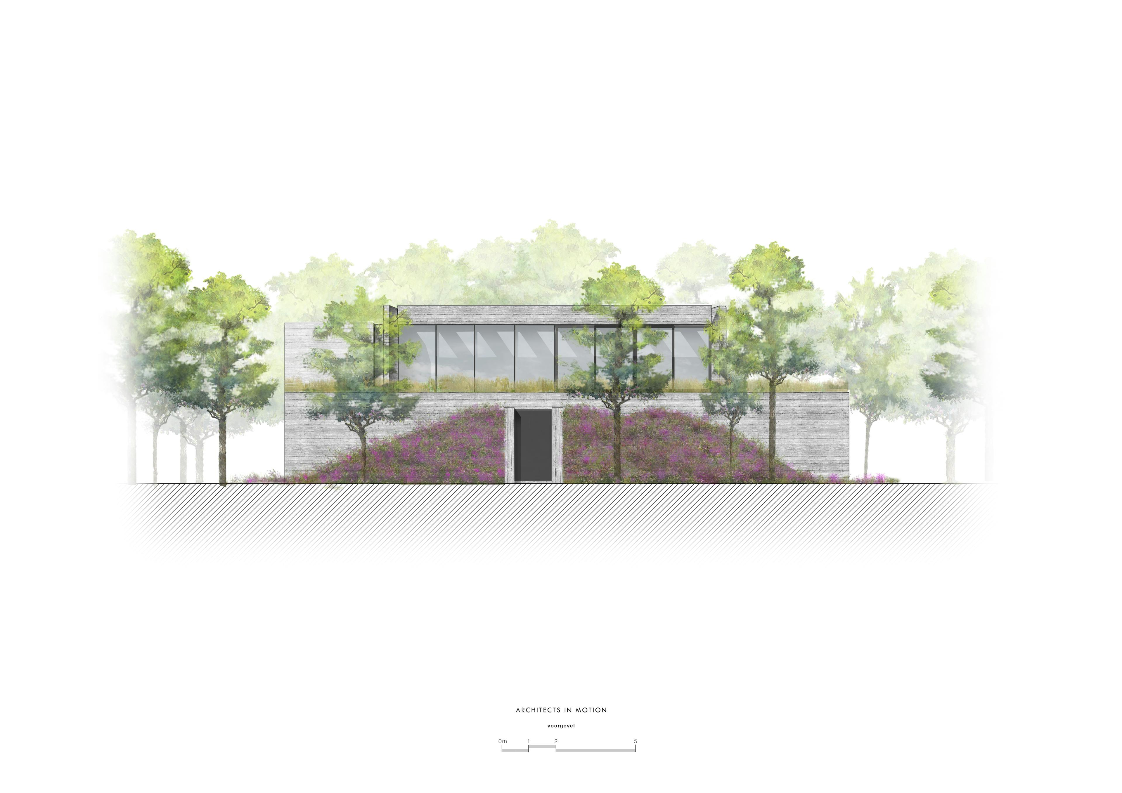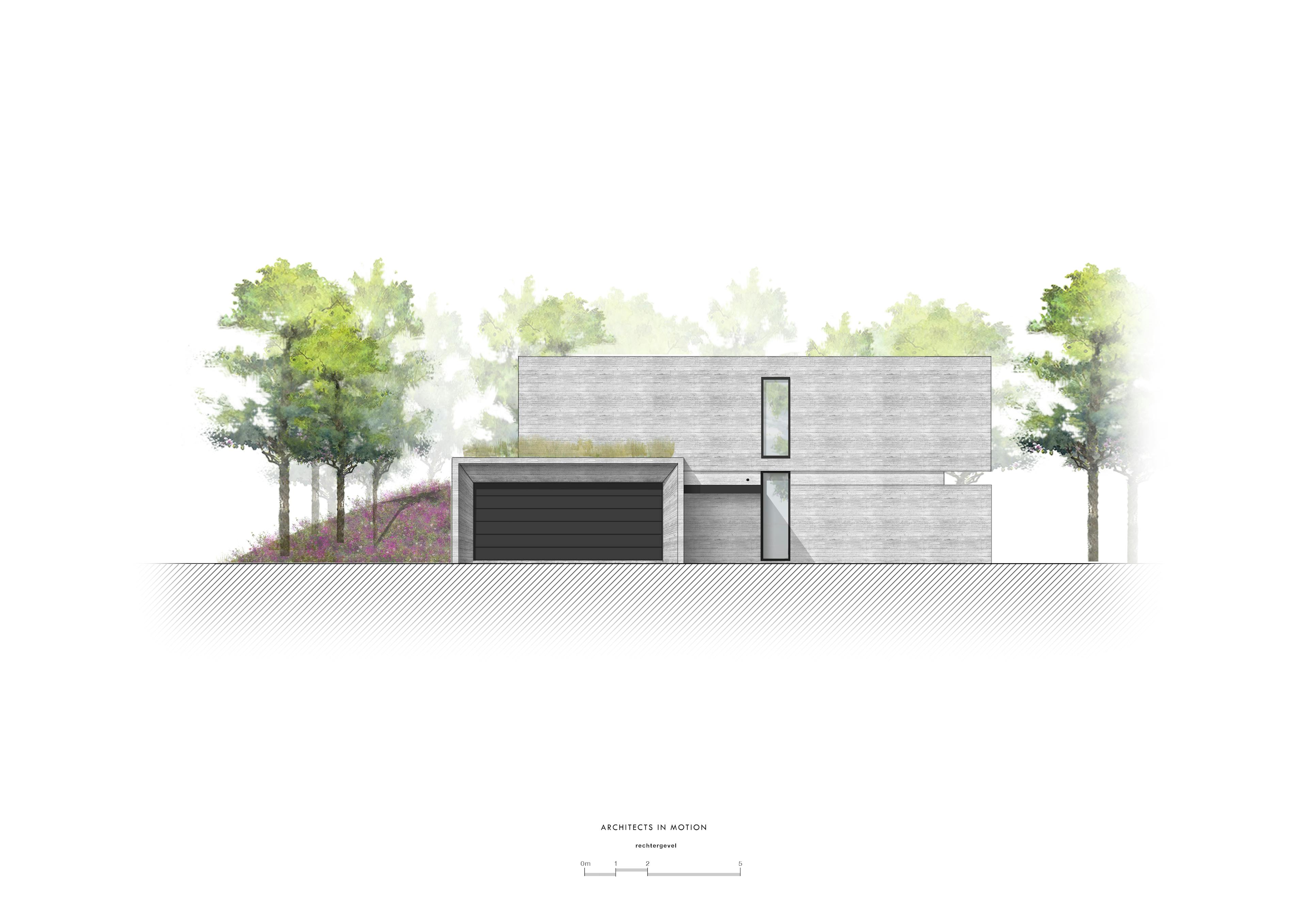 Twee zichtassen, een op het gelijkvloers van de voordeur naar de tuin en op de verdieping van de trap naar de zijtuinstrook, zijn de twee belangrijkste componenten van deze structuur. Nog voor je de woning betreedt, ervaar je de eerste zichtas meteen door de manier waarop de toegang tot de woning georganiseerd werd. Twee betonnen wanden snijden loodrecht door de aangelegde - met heide beplantte – heuvel en leiden je tot de voordeur. De heuvel is duidelijk een ode aan het Kempisch landschap en een veruiterlijking van het respect dat de architect voor de eigenheid van de lokale vegetatie heeft. De volledig in met plankenbekisting uitgevoerde zichtbetonnen woning nestelt zich in het landschap en stelt zich ondergeschikt op aan de natuur. De confrontatie tussen cultuur/architectuur en natuur/landschap gebeurt op een zachte manier. De op het gelijkvloers volledig gesloten voorgevel vormt de grens tussen de openbare wereld en de intimiteit van de woning. Links van de inkomzone bevindt zich een bureau met speelhoek voor de kinderen die via een deur rechtstreeks in contact staat met een zithoek waarbij een vide deze ruimte een bijzonder plechtig karakter geeft als belevingshart van de woning. Het is naast de traphal de enige plek in de woning waar – ondanks het gesloten karakter en dankzij de vide - de twee zichtassen visueel verbonden zijn. Als je je in deze ruimte bevindt, is het alsof alle kwaliteiten van de woning zich hier manifesteren. Hoewel je door het grote raam in de achtergevel zicht hebt naar de tuin en de vide ook in de derde dimmensie ruimtelijkheid verschaft, voel je een mentale concentratie en voel je je aangenaam geïsoleerd van de buitenwereld maar toch niet afgesloten.