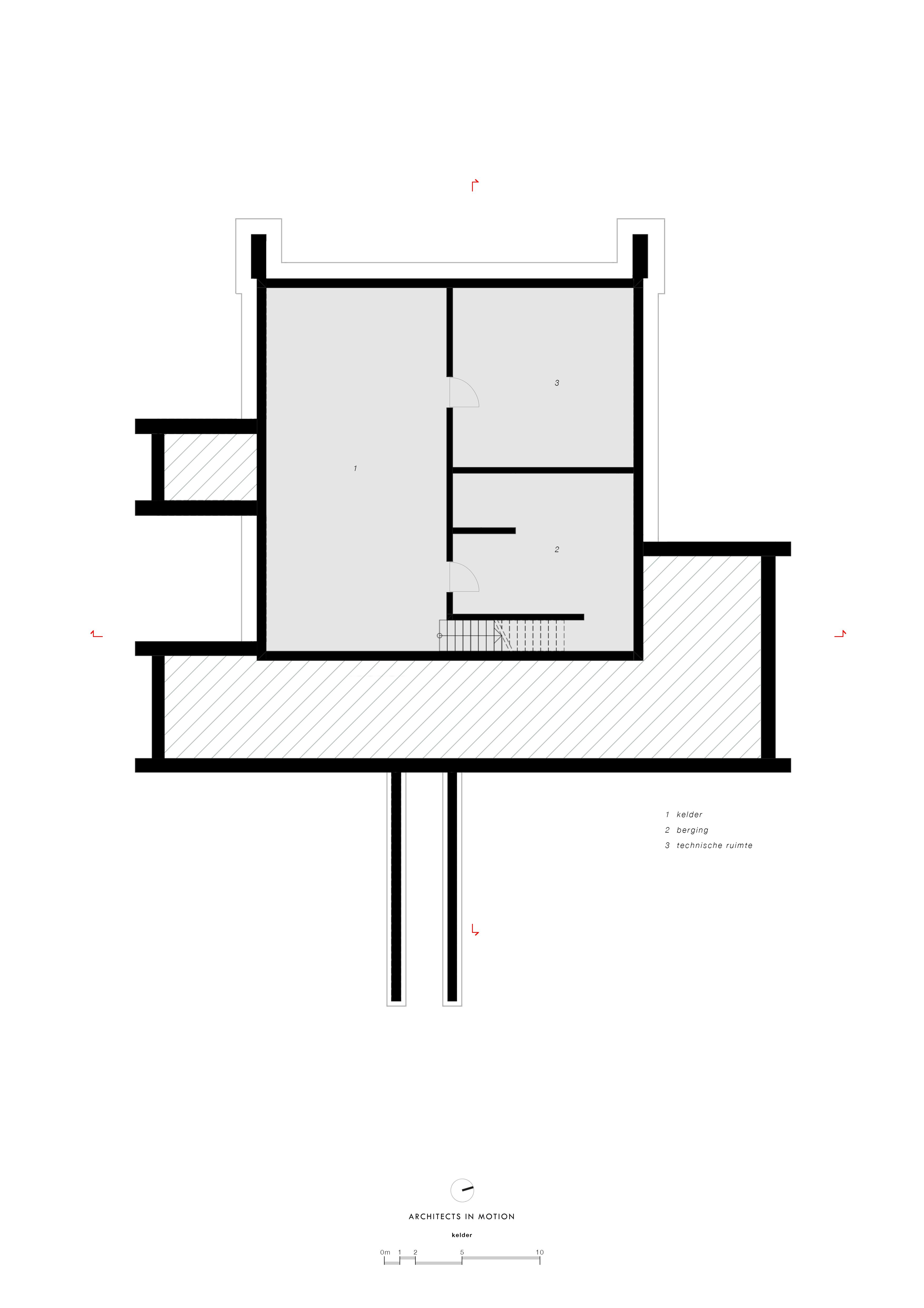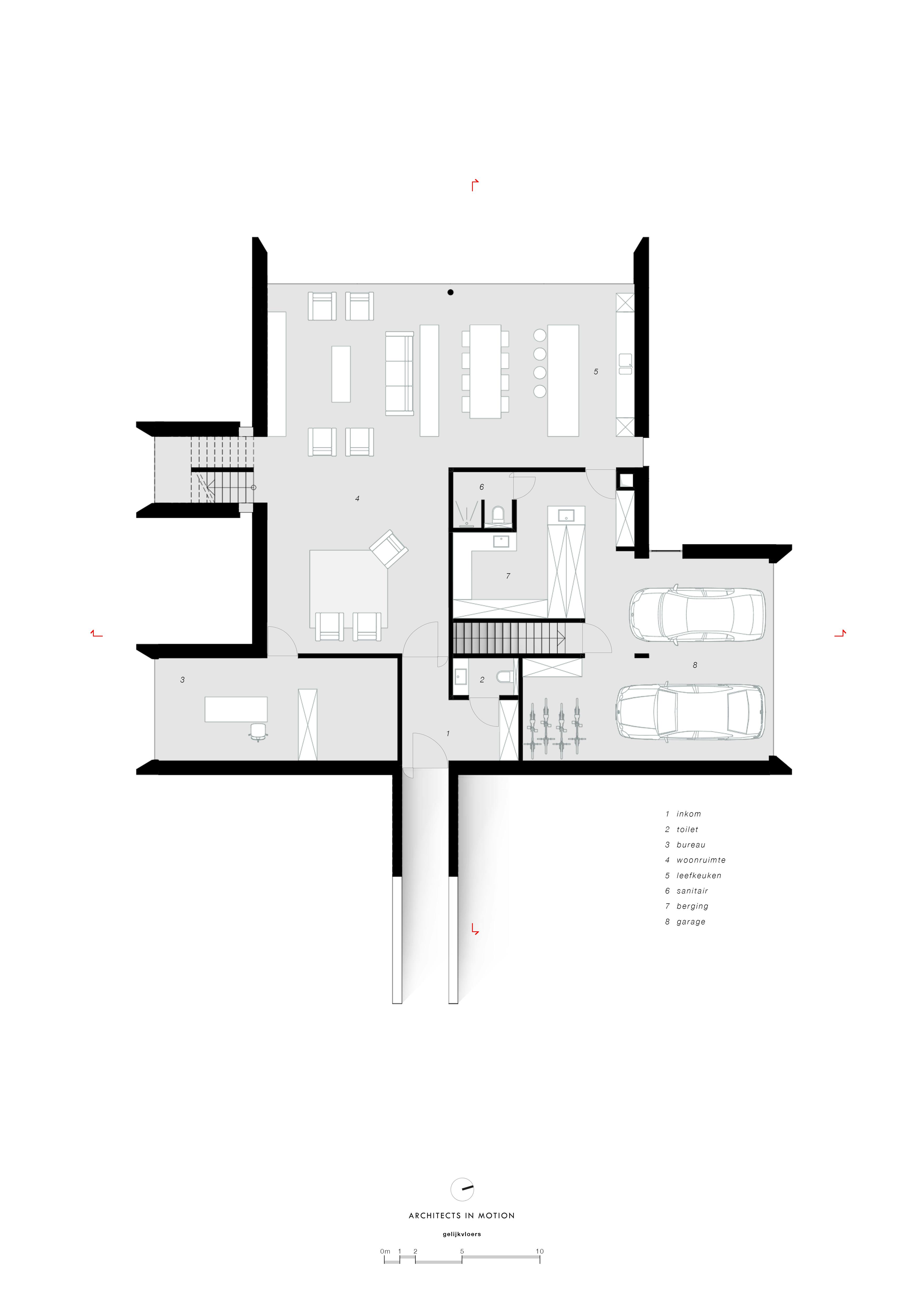 Rechts naast de inkomzone en de dubbelhoge zithoek bevindt zich de garage/bergingzone. Deze biedt plaats voor twee auto’s, fietsen, een grote berging met extra sanitair en de trap naar de ruime kelder. Ze heeft een aparte dienstingang in de rechter zijtuinstrook. De ‘promenade architecturale’ via de zichtas brengt je achteraan in de woning in een grote open ruimte met keuken, eethoek en zichthoek. Het immense raam met een breedte van 12 m biedt een overweldigend zicht op de tuin. Slechts één stalen kolom in het midden draagt de bovenliggende verdieping. Even spectaculair is het zicht door de buiten het hoofdvolume van de woning liggende traphal. Het raam naast de keuken dat in het verlengde ligt van de traphal, kondigt de tweede zichtas op de verdieping subtiel aan. Het volume van de traphal is gescheiden van het hoofdvolume door twee verticale strookramen. De verschillende gebruikte materialen in de traphal vormen meteen een staalkaart van het materiaalgebruik in de rest van woning: de centrale trapwand is in zichtbeton, net zoals de meeste wanden in de woning. De traptreden zijn uitgevoerd in hout en worden onzichtbaar bevestigd in de wanden om het daglicht en het zicht zo weinig mogelijk te belemmeren. Hout vinden we ook terug op de wand tussen de bureauruimte en de zithoek. Net als bij Lampens brengt het contrast tussen het zachte materiaal hout en de harde materialen betonsteen en gewapend, ruw bekist beton een weldoordachte rust in het interieur. Enkele bepleisterde elementen maken de logisch aanvoelende afwisseling compleet. Ook in de traphal vinden we het originele detail van de afgeschuinde betonnen wanden terug alsof de natuur als een soort ingelijst kunstwerk de woning extra beleving en een blik naar buiten verschaft.