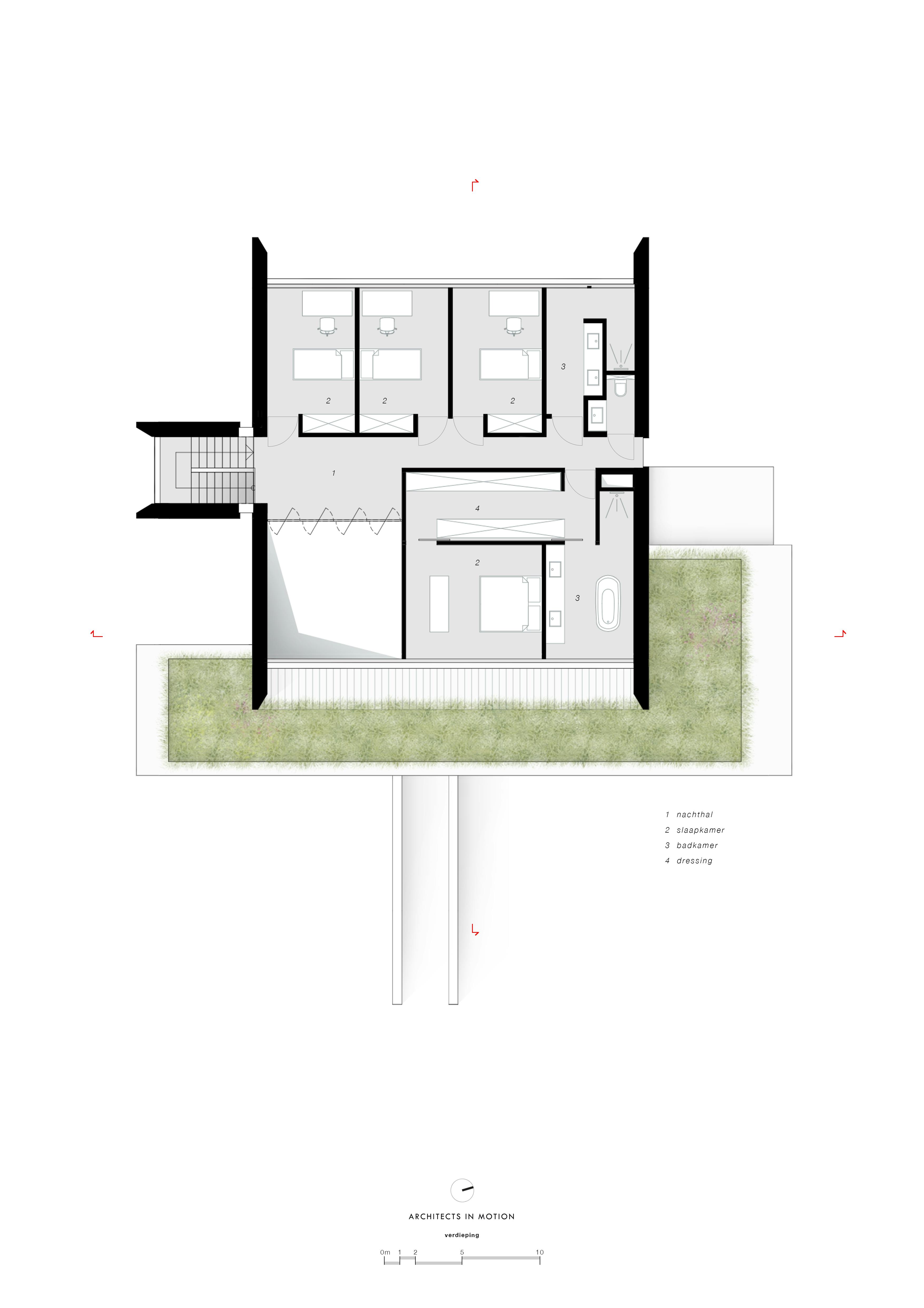 Op de verdieping werden drie kinderkamers, een badkamer en een ensuite master bedroom met dressing en aparte badkamer ontworpen. De vide boven de zitruimte is van de nachthal visueel en akoestisch afsluitbaar door pivoterende houten panelen die op de in hetzelfde hout uitgevoerde borstwering gemonteerd worden. Het versterkt het ingetogen karakter van de zithoek.